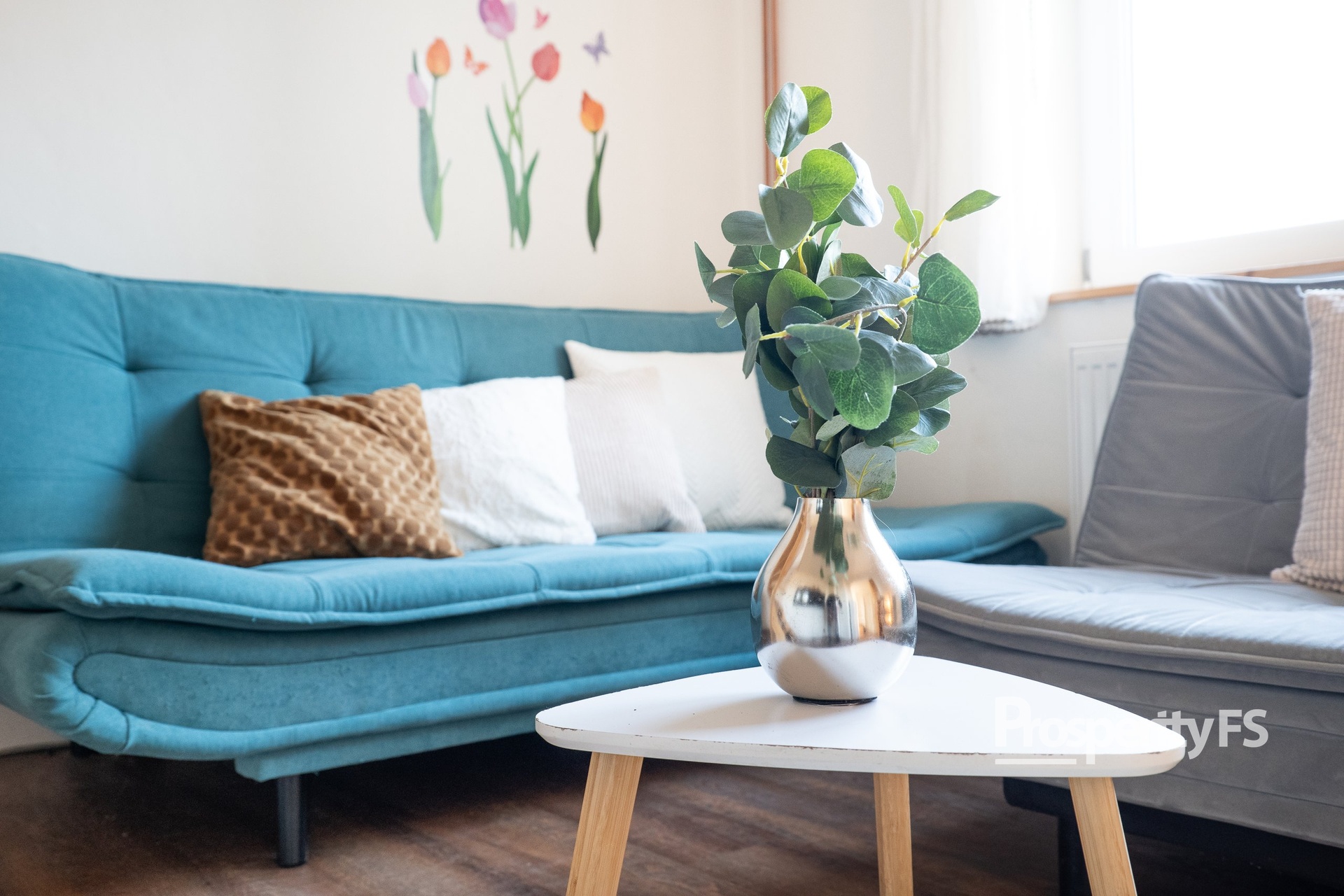 - Podlahy jsou v kombinaci zátěžového vinylu, koberce a dlažby