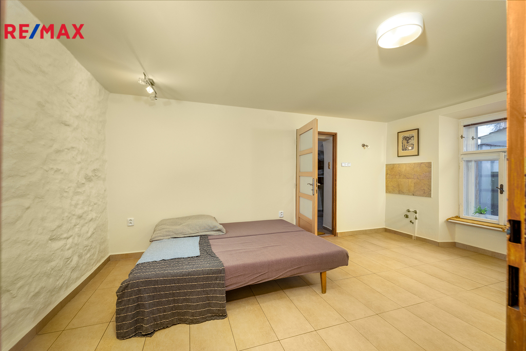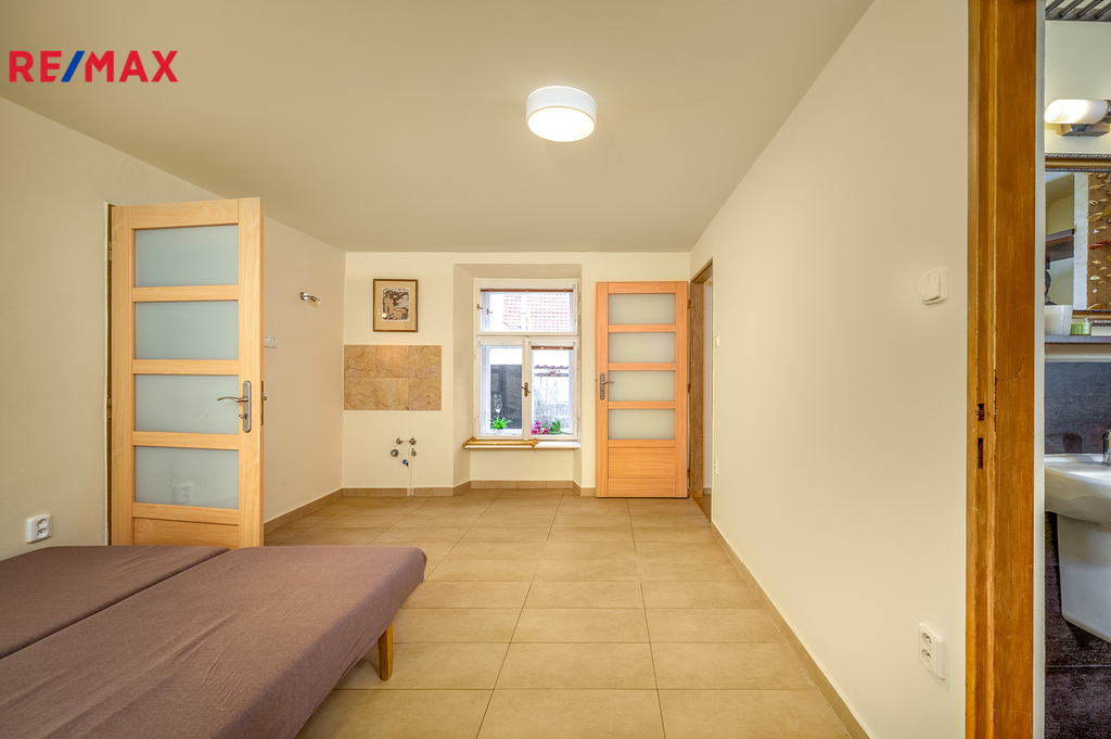 Tomuto podlaží dominuje velká obytná a světlá místnost (cca 33 m2) se zachovanou masivní dřevěnou podlahou a dále je zde další samostatná místnost (s hotovými rozvody např. na další kuchyň nebo koupelnu) a vstup do horní části přístavku nad místem pro kryté sezení na dvorku.