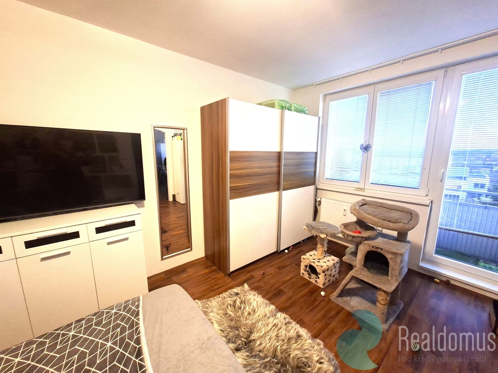 Dále pak prostorným obývacím pokojem se vstupem na balkon. Koupelna je zděná se sprchovým koutem a toaletou.