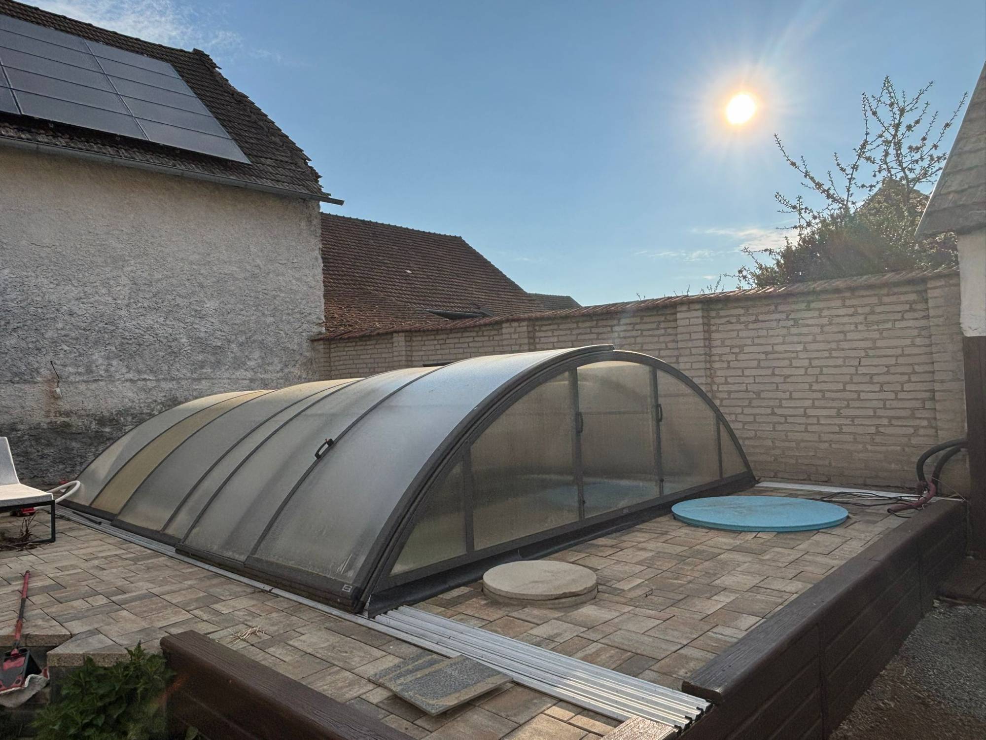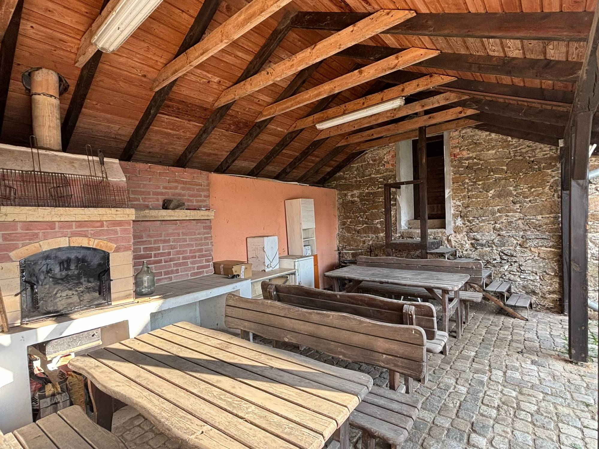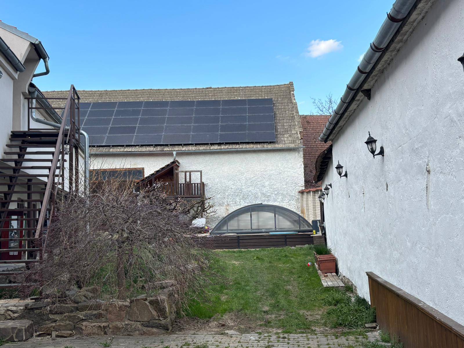 Exteriér domu nabízí uzavřený dvůr s bazénem, který poskytuje dostatek soukromí pro relaxaci i rodinné aktivity. Na dvůr navazují dvě stodoly, z nichž jedna ukrývá dva sklepy a technickou místnost. Přes stodoly je dále zajištěn přístup na zahradu a do sadu, což ocení zejména milovníci přírody, zahradničení nebo hospodaření.