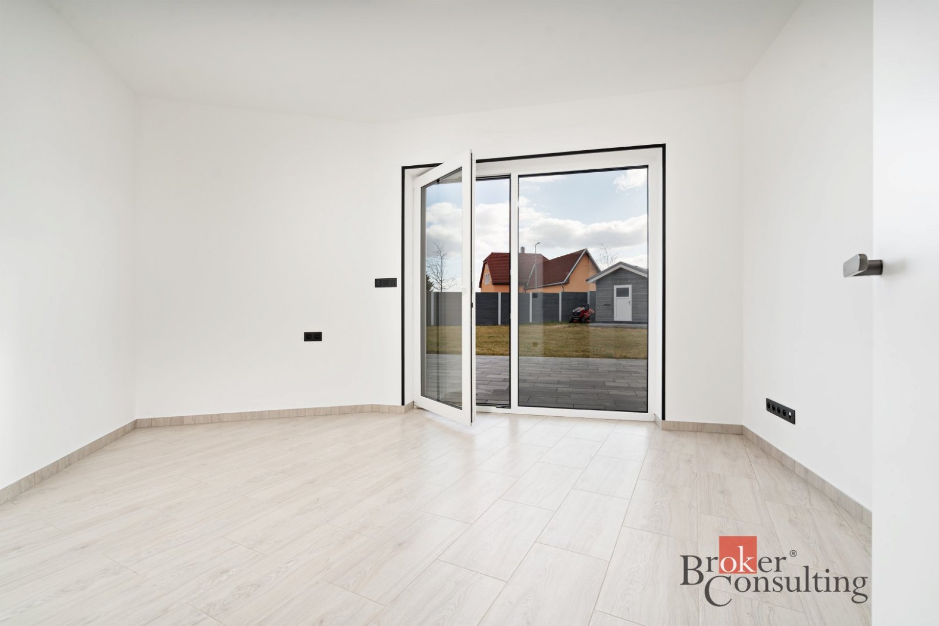 • Vjezd na zahradu: Dálkově ovládaná posuvná vstupní brána.