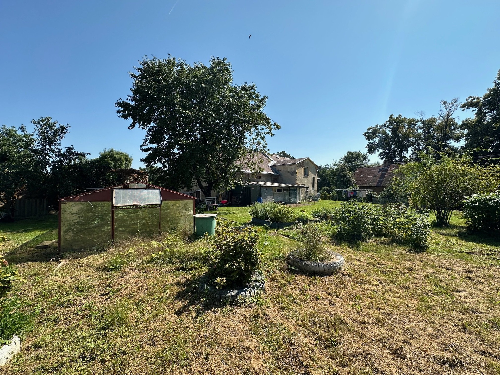 Dům disponuje opravdu velkou zahradou, na které jsou již vzrostlé ovocné stromy, skleník a k domu patří velká zemědělská budova s dalším využitím např. podnikání.