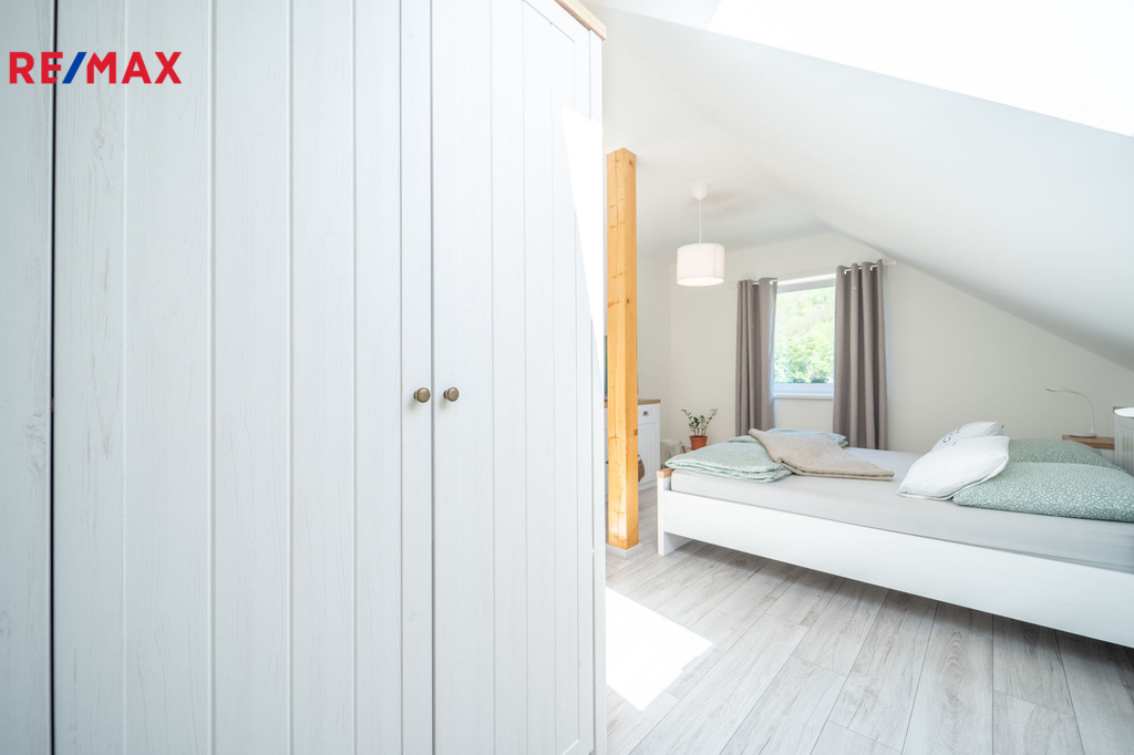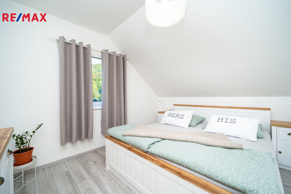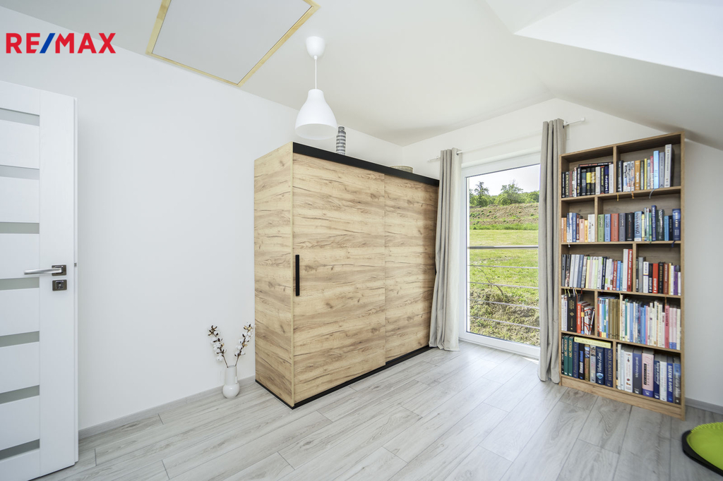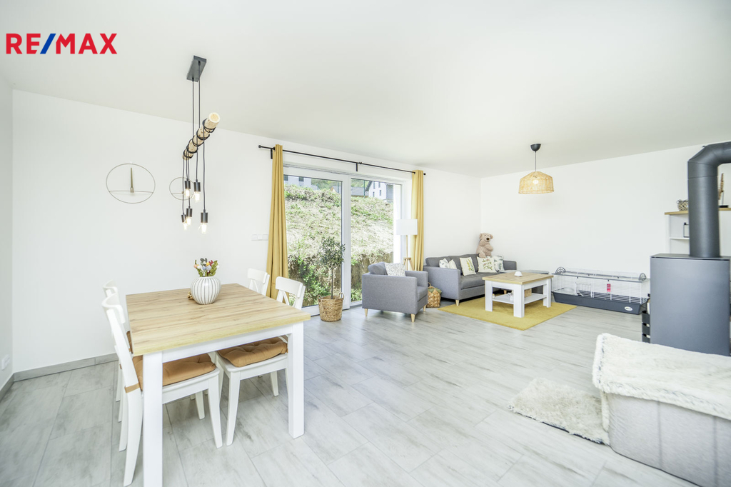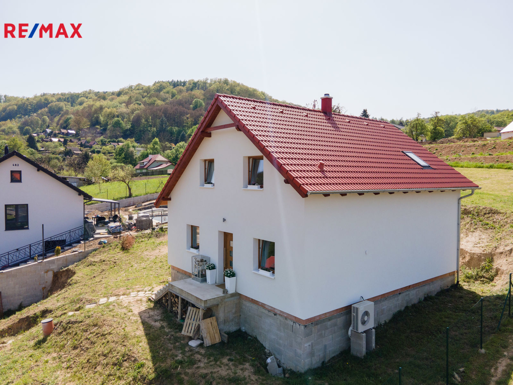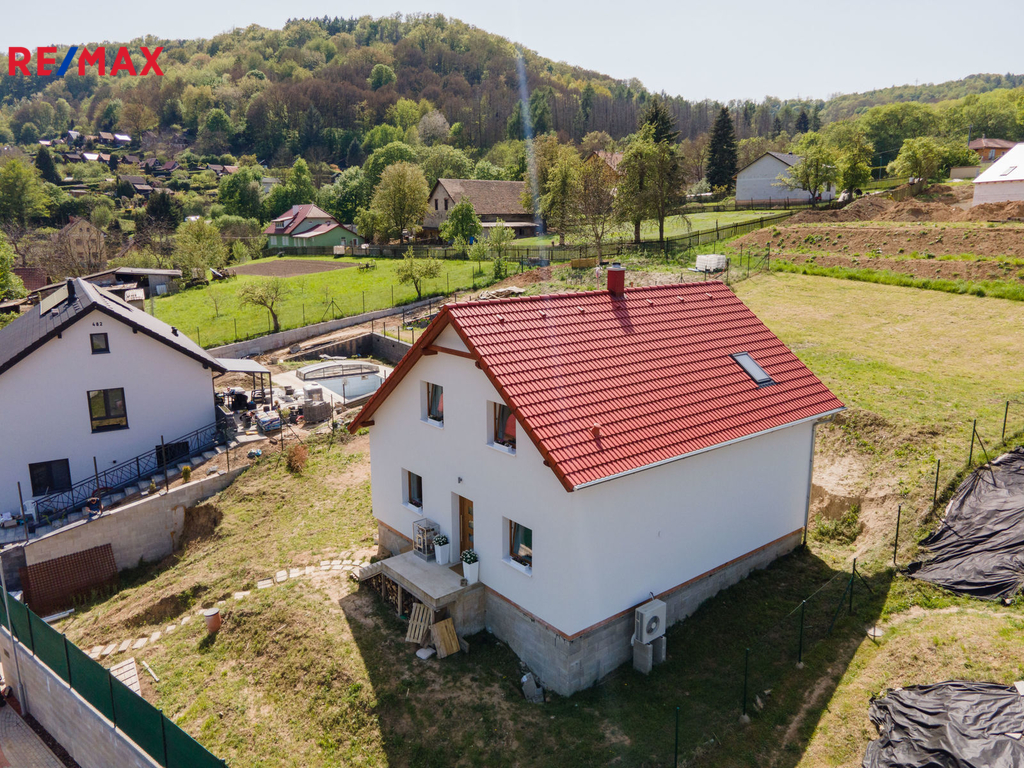 V přízemí domu se nachází vstupní chodba, koupelna se sprchovým koutem, toaletou a bidetem, technická místnost, kuchyňský kout včetně vestavěných spotřebičů (myčka, mikrovlnka, indukční deska a el. trouba) s komorou a obývací částí, ze které je přímý vstup na zahradu. Po schodišti se dostaneme do podkroví, kde jsou 3 ložnice a koupelna s vanou a toaletou. Okna jsou plastová tříkomorová. Vytápění a ohřev vody zajištuje tepelné čerpadlo s bojlerem. V celém domě je podlahové topení, které kombinuje komfortní rodinné bydlení s nízkými náklady na provoz. V obývací části je možné dále k vytápění využít krbová kamna. Jedná se zateplený zděný dům z cihel Porotherm, na střeše je betonová taška KM Beta. Pod pozemkem u obecní komunikace je vybudovaná opěrná zeď. Veškerá stavební dokumentace k dispozici k nahlédnutí.