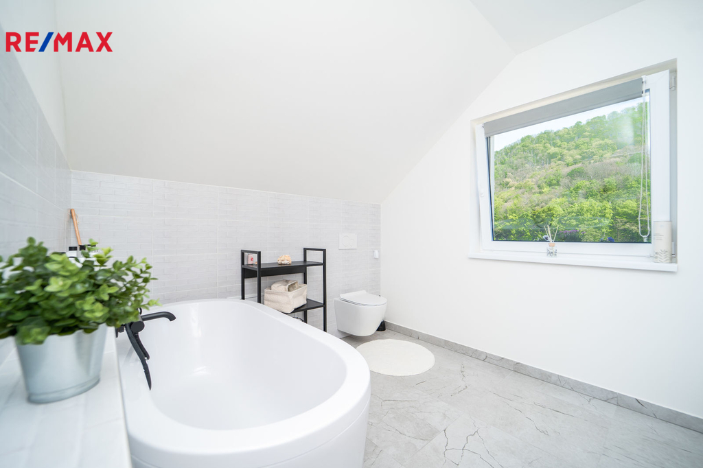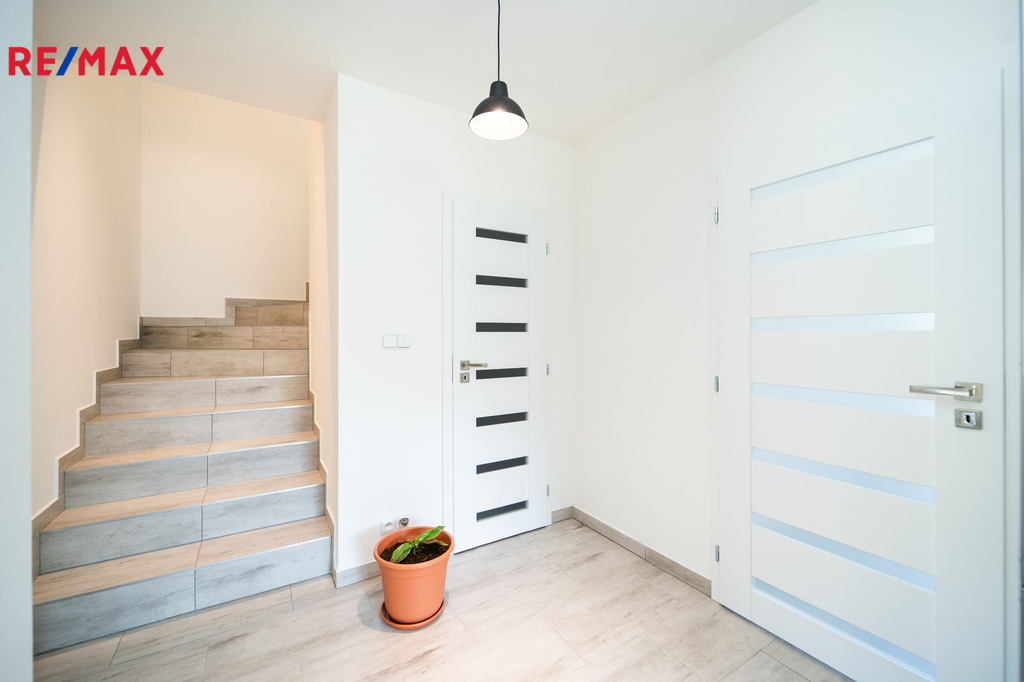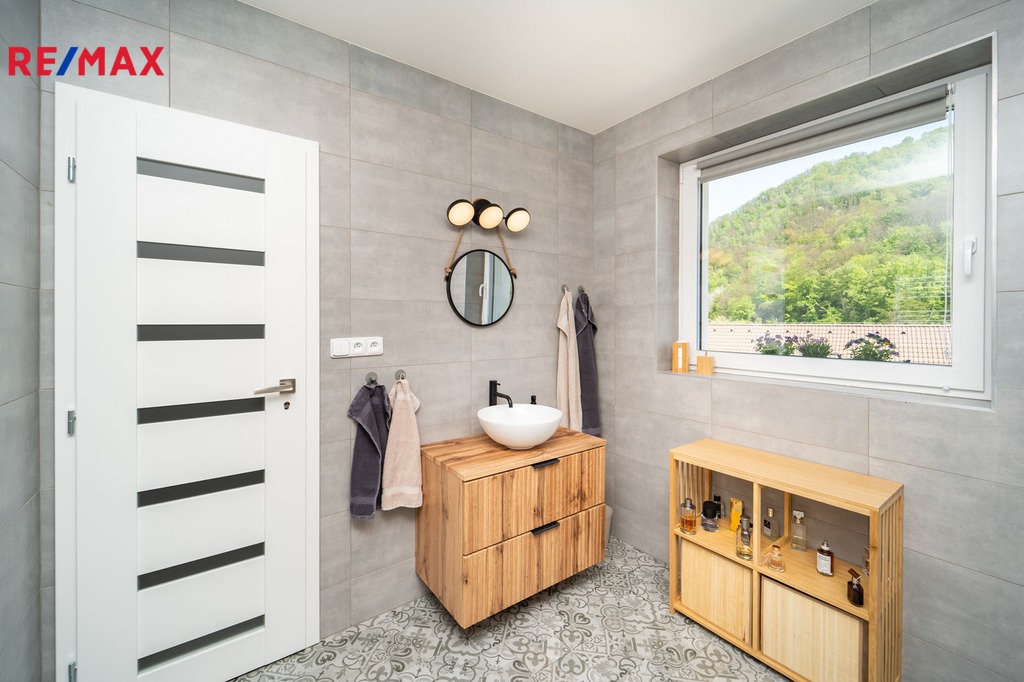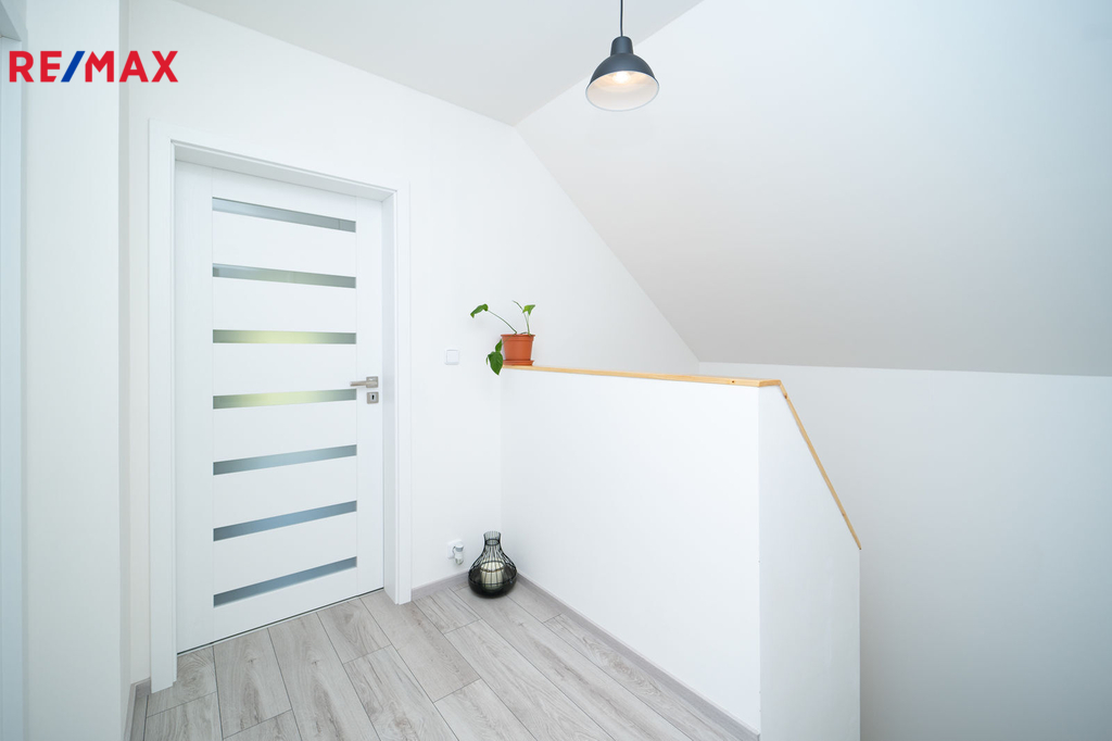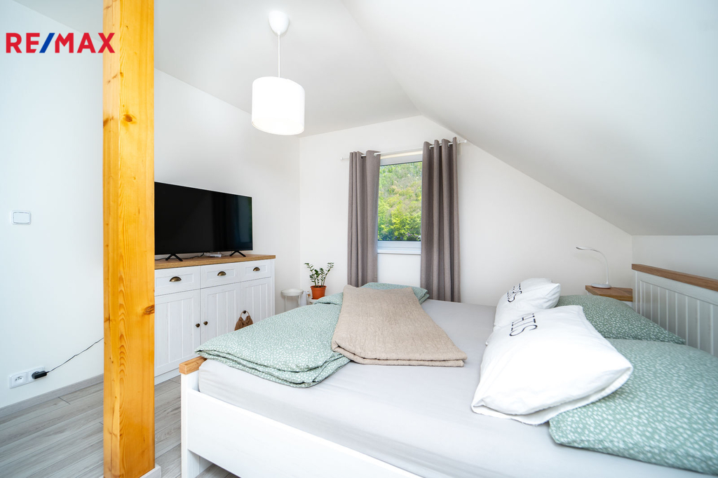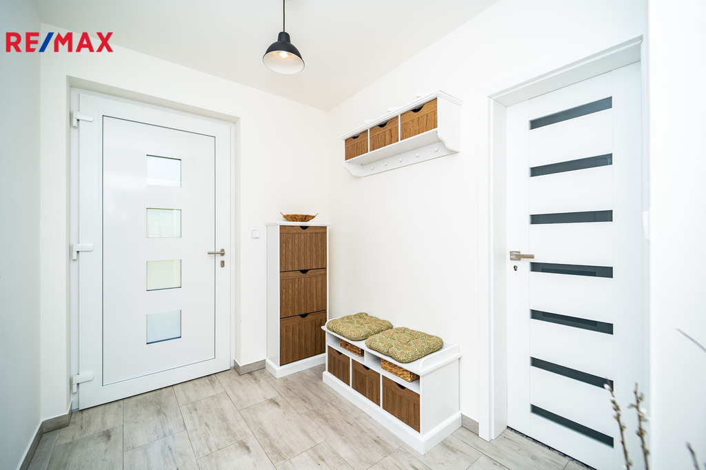 V přízemí domu se nachází vstupní chodba, koupelna se sprchovým koutem, toaletou a bidetem, technická místnost, kuchyňský kout včetně vestavěných spotřebičů (myčka, mikrovlnka, indukční deska a el. trouba) s komorou a obývací částí, ze které je přímý vstup na zahradu. Po schodišti se dostaneme do podkroví, kde jsou 3 ložnice a koupelna s vanou a toaletou. Okna jsou plastová tříkomorová. Vytápění a ohřev vody zajištuje tepelné čerpadlo s bojlerem. V celém domě je podlahové topení, které kombinuje komfortní rodinné bydlení s nízkými náklady na provoz. V obývací části je možné dále k vytápění využít krbová kamna. Jedná se zateplený zděný dům z cihel Porotherm, na střeše je betonová taška KM Beta. Pod pozemkem u obecní komunikace je vybudovaná opěrná zeď. Veškerá stavební dokumentace k dispozici k nahlédnutí.