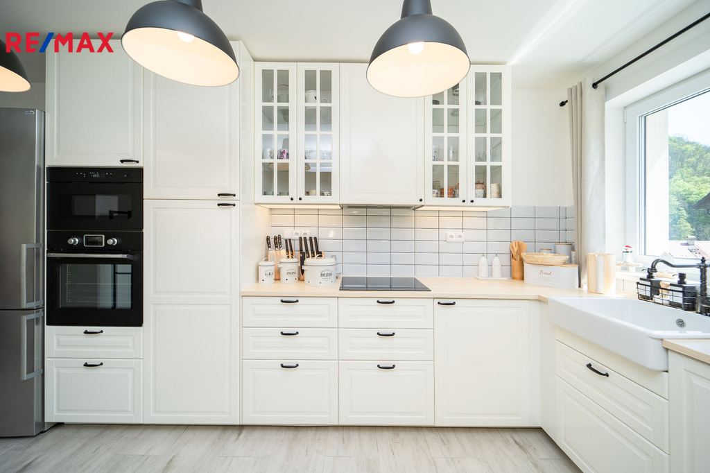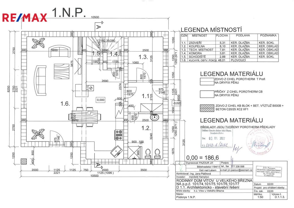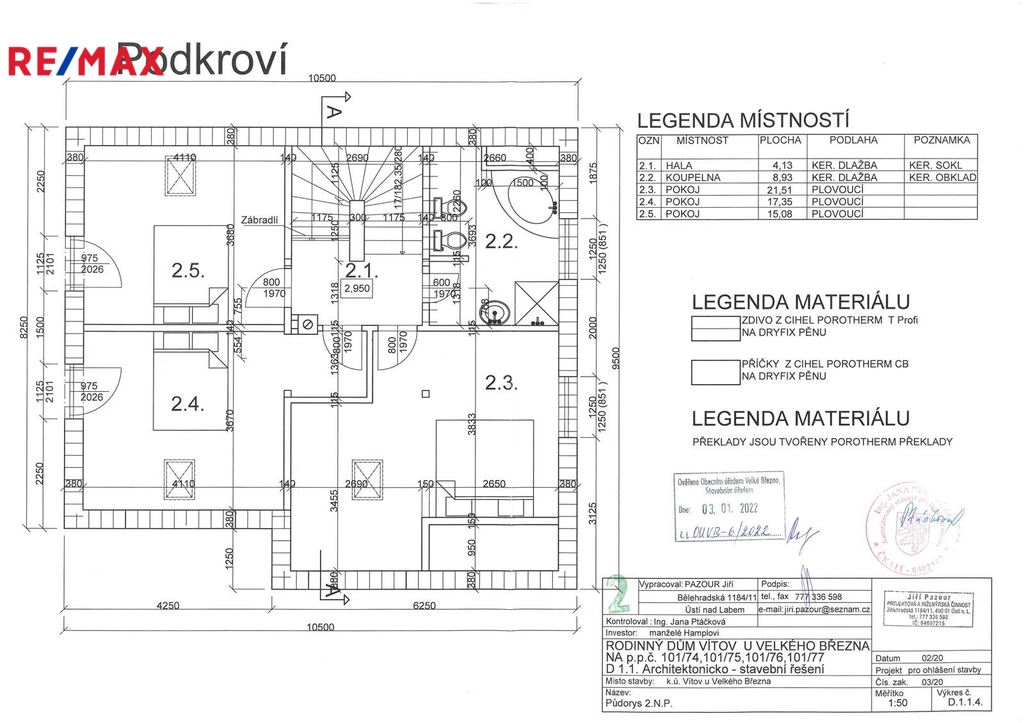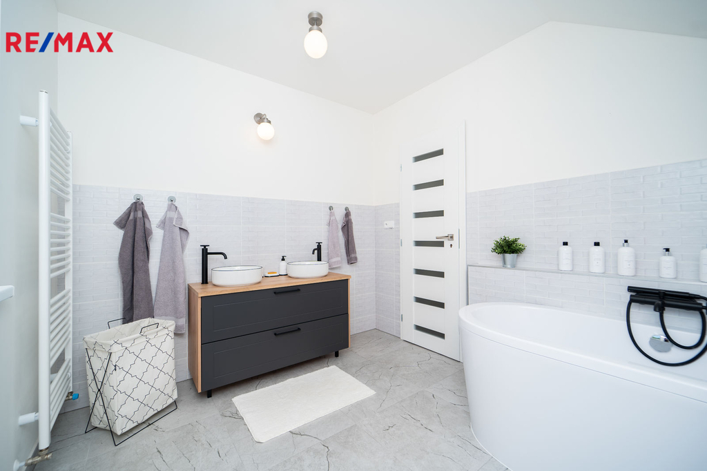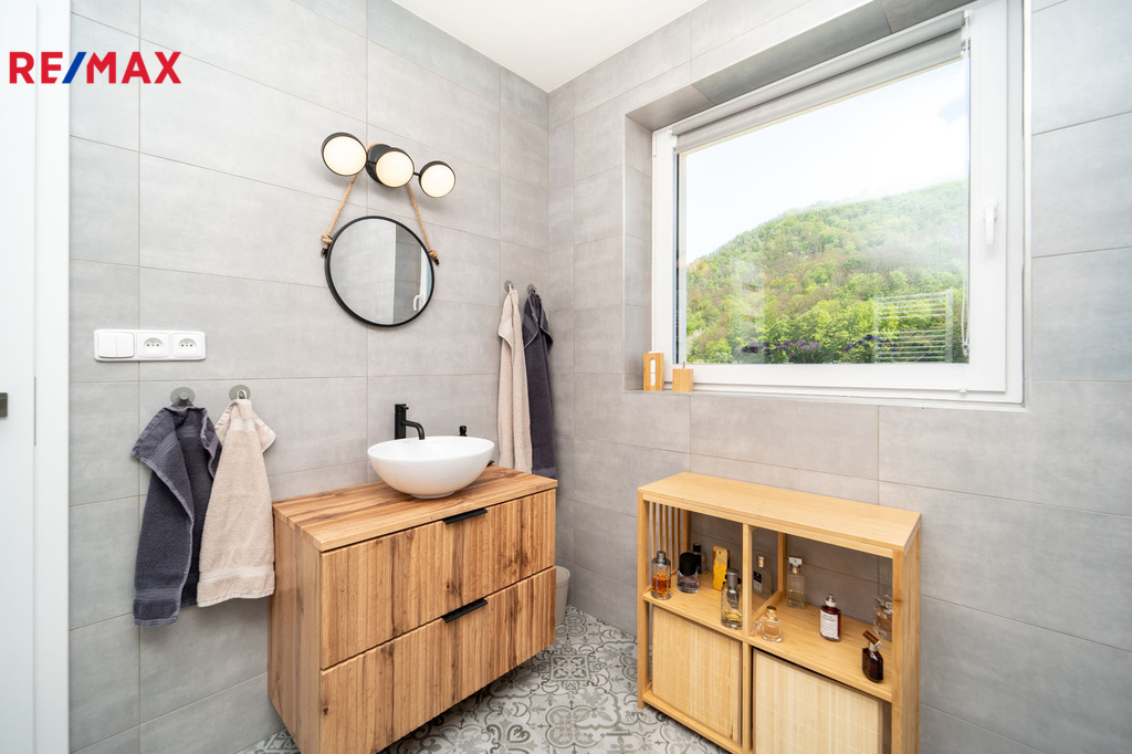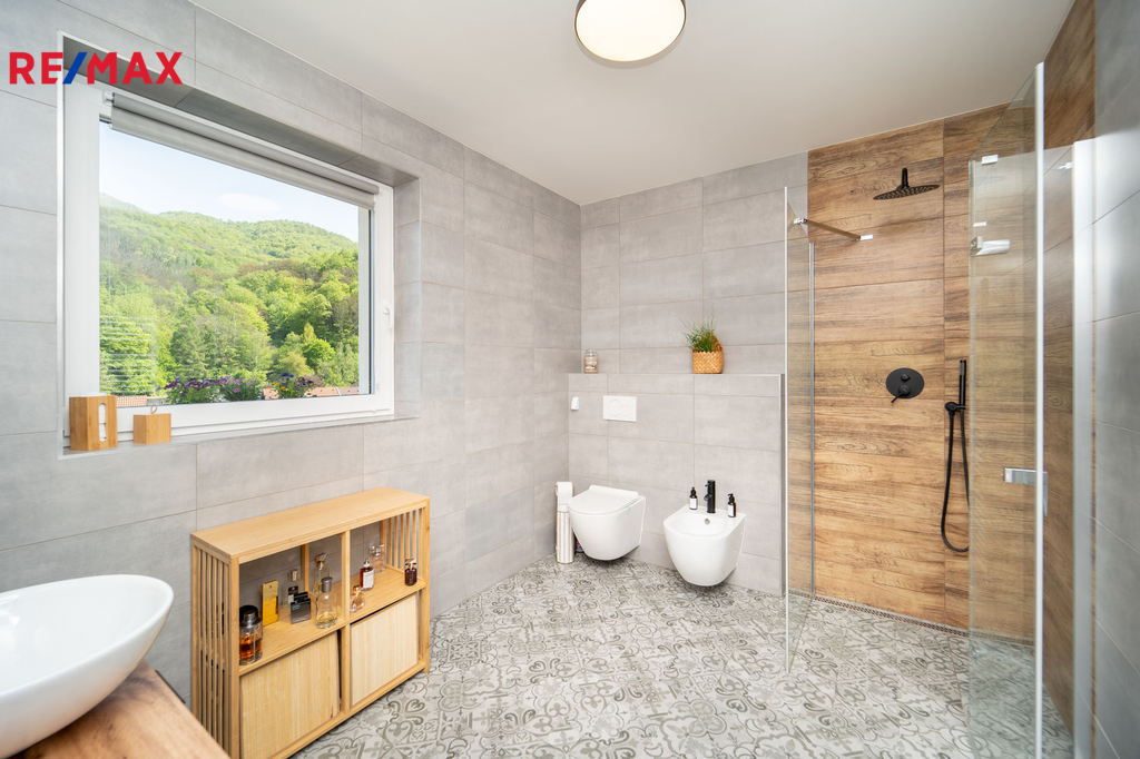 V přízemí domu se nachází vstupní chodba, koupelna se sprchovým koutem, toaletou a bidetem, technická místnost, kuchyňský kout včetně vestavěných spotřebičů (myčka, mikrovlnka, indukční deska a el. trouba) s komorou a obývací částí, ze které je přímý vstup na zahradu. Po schodišti se dostaneme do podkroví, kde jsou 3 ložnice a koupelna s vanou a toaletou. Okna jsou plastová tříkomorová. Vytápění a ohřev vody zajištuje tepelné čerpadlo s bojlerem. V celém domě je podlahové topení, které kombinuje komfortní rodinné bydlení s nízkými náklady na provoz. V obývací části je možné dále k vytápění využít krbová kamna. Jedná se zateplený zděný dům z cihel Porotherm, na střeše je betonová taška KM Beta. Pod pozemkem u obecní komunikace je vybudovaná opěrná zeď. Veškerá stavební dokumentace k dispozici k nahlédnutí.