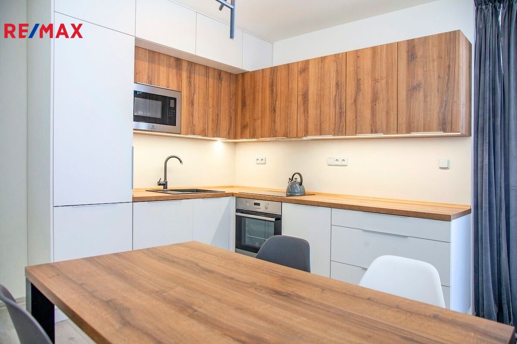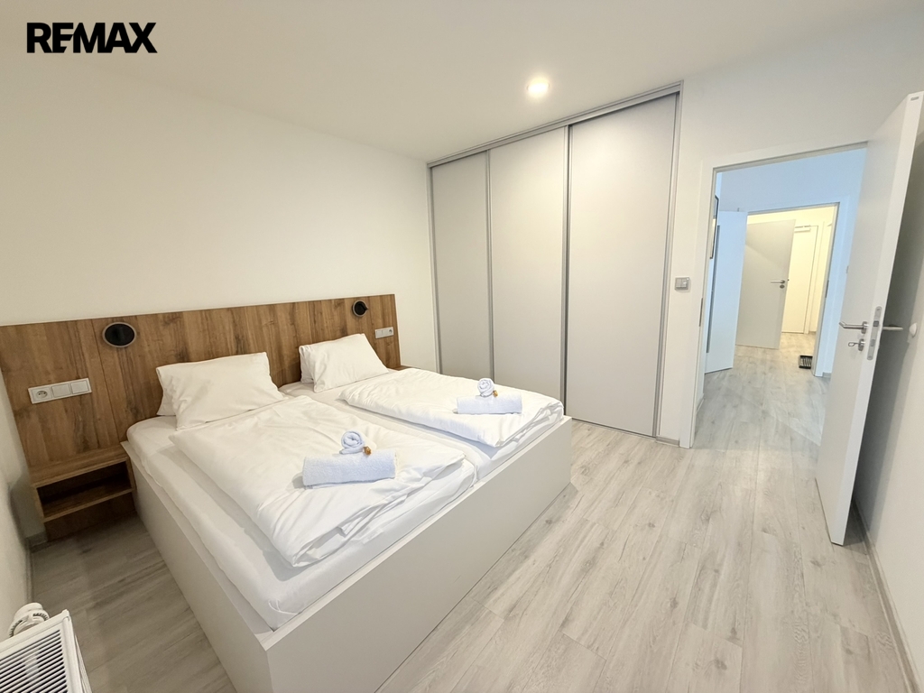 Apartmán je dispozičně řešen jako 2+kk a nabízí příjemně vzdušný prostor. Najdete zde praktický kuchyňský kout s jídelní částí, na který navazuje obývací prostor s výstupem na terasu. Dále samostatný pokoj se zabudovanými skříněmi a úložným prostorem a koupelna s WC.