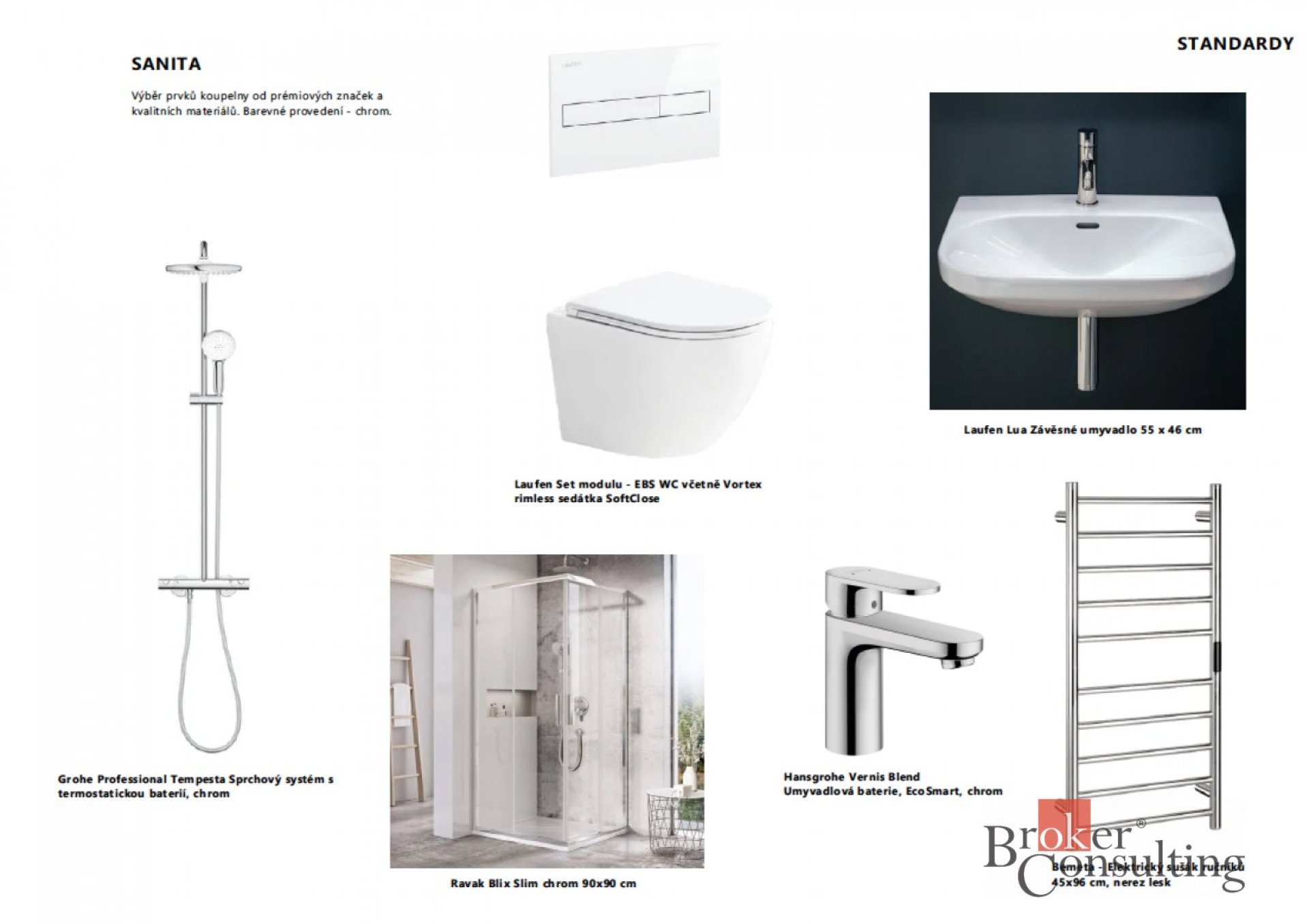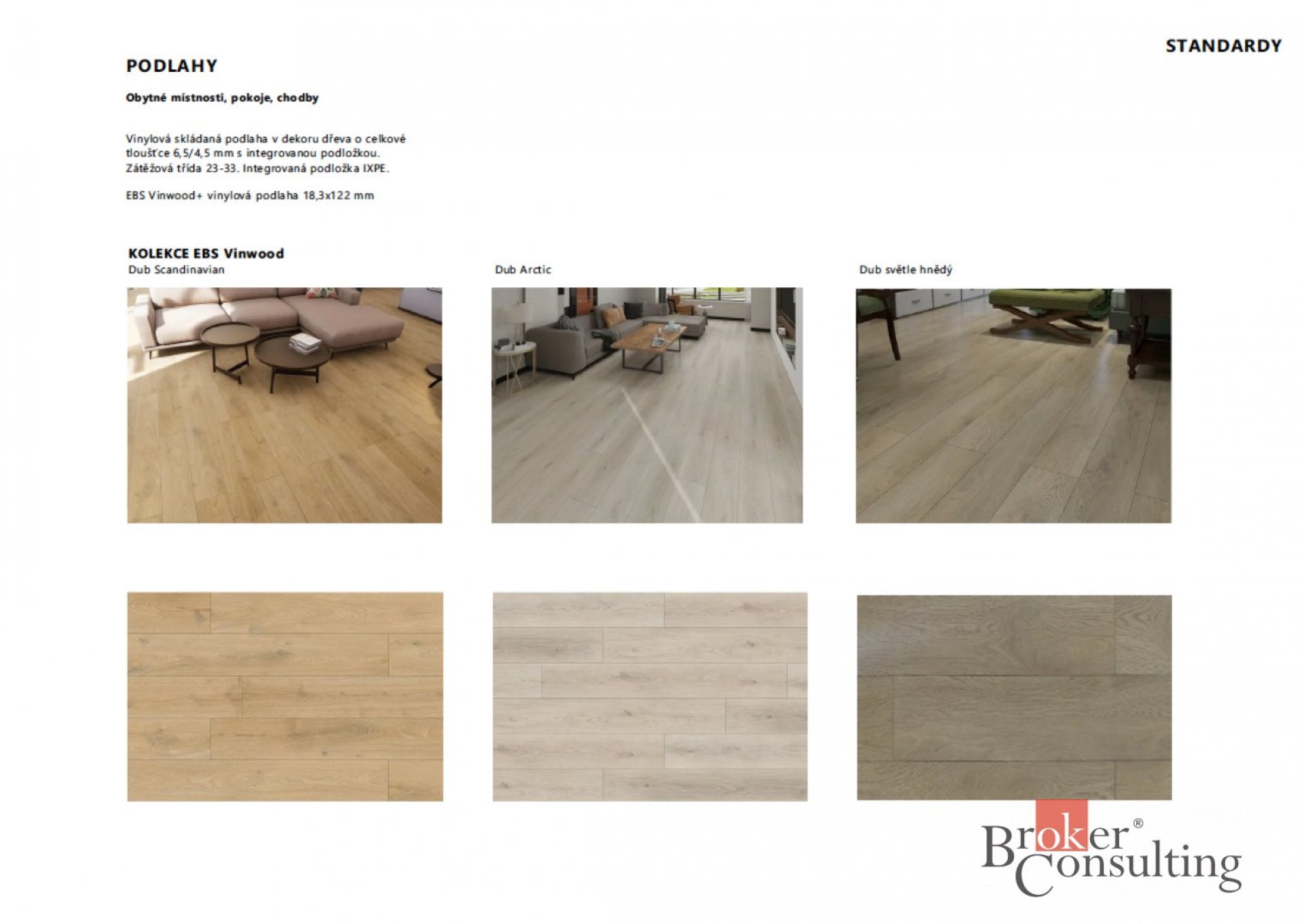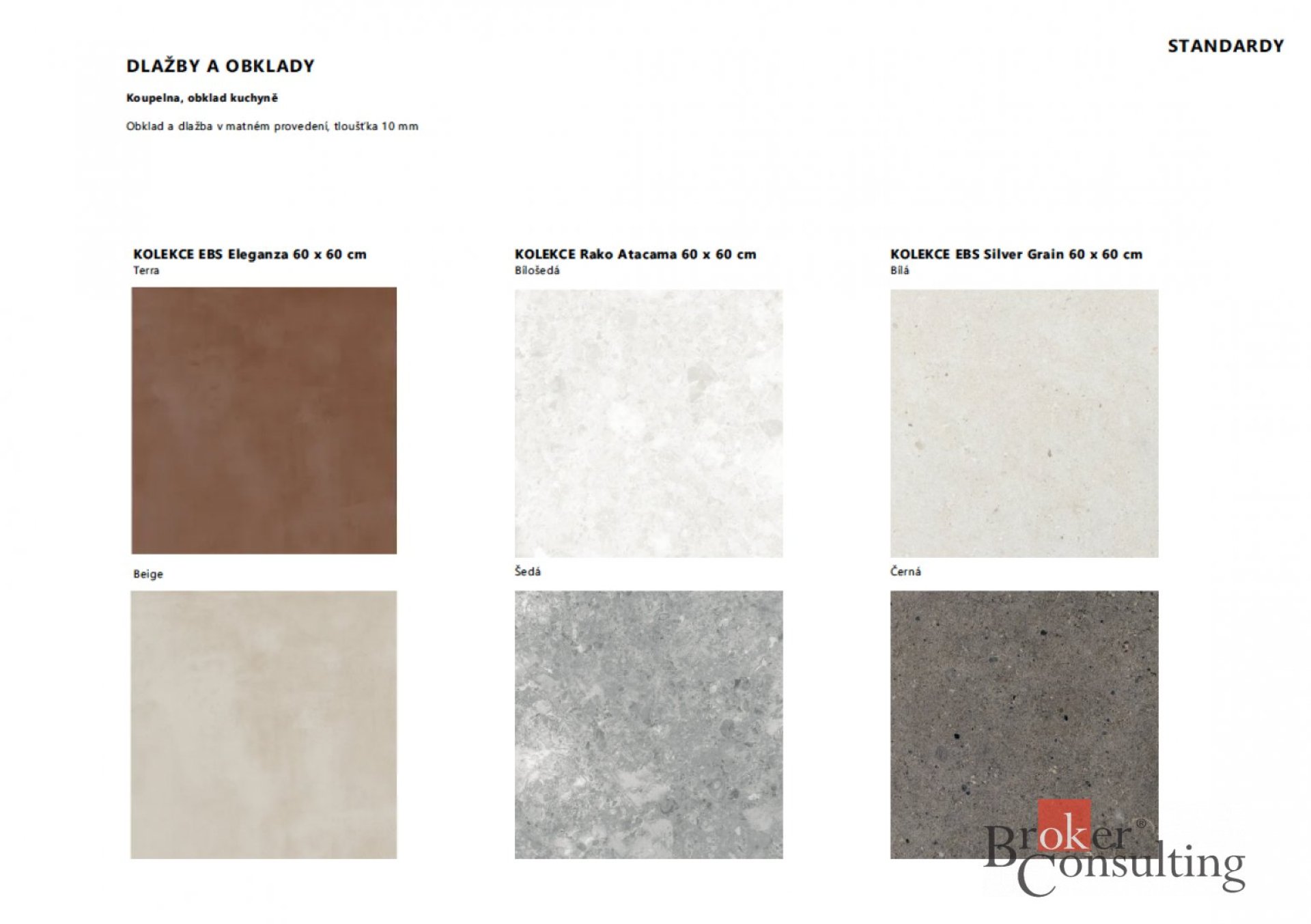- Možnost výběru podlah, dveří, obkladů, dlažeb a sanity ze standardu (viz fotodokumentace)