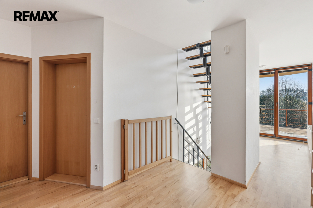 Z terasy je nádherný výhled do zeleně a do okolní krajiny. To, co tuto nemovitost skutečně odlišuje od ostatních, je kombinace naprostého soukromí a velkorysé výměry domu i pozemku.