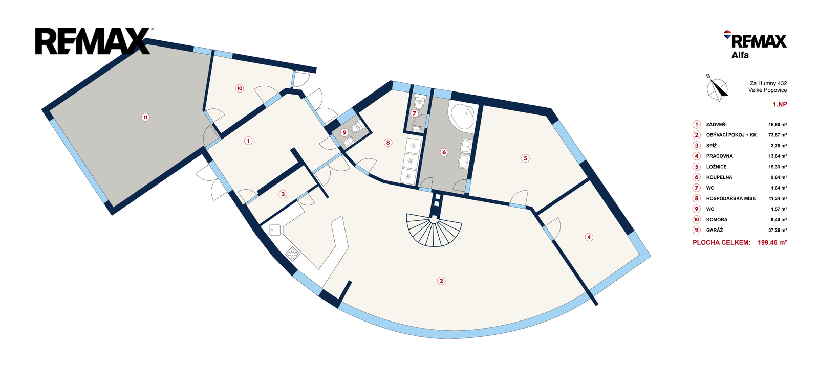 • velkorysý obývací prostor s krbem (cca 73 m²)