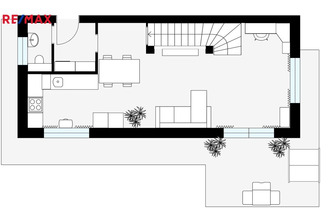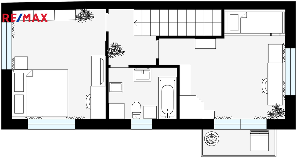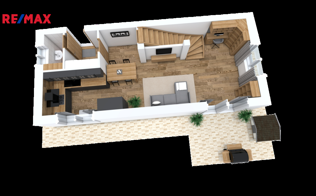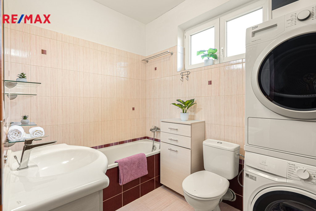 Byt je rozdělen do dvou pater (viz půdorysy ve fotogalerii): v 1.NP se nachází předsíň s vestavěnou skříní (3,04m2), samostatné WC (1,87m2), komora pod schodištěm (cca 2m2), obývací pokoj (31,50m2) se zdařile zrekonstruovaným kuchyňským koutem (6,15m2) s kvalitními vestavěnými spotřebiči. Z obývacího pokoje je vstup na terasu do udržované zahrady s příjemným posezením.