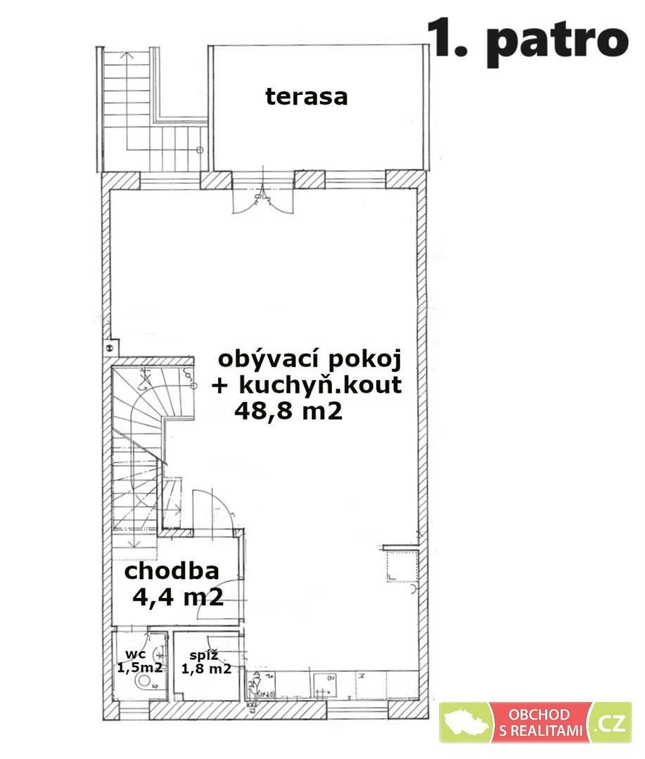 V prvním patře se nachází hlavní obytný prostor s kuchyňským koutem o celkové výměře 49 m2, odtud je výstup na terasu / zahradu, dále se v tomto patře nachází komora a WC.