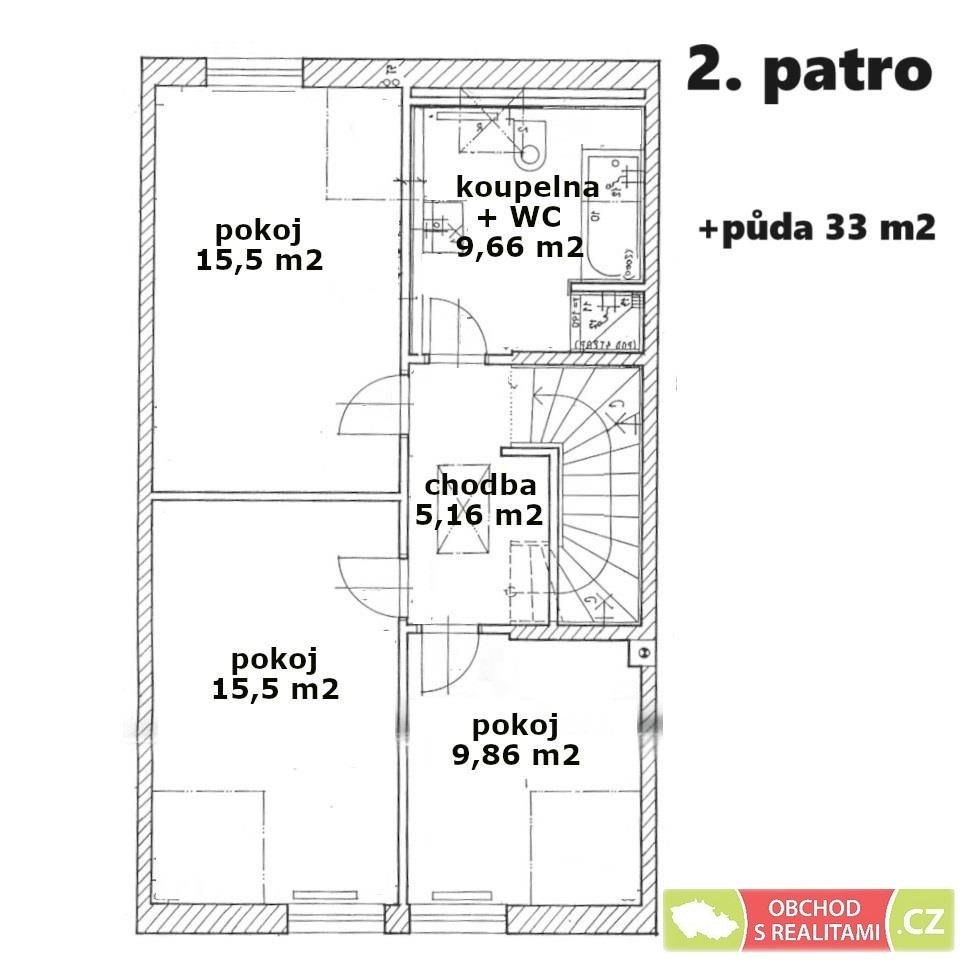 Prostorovou rezervou domu / pracovnou oddělenou od dění v domě / prostorem pro příležitostné přespání může být 33 m2 velká půda, kterou prosvětlují 2 okna a jsou zde radiátory centrálního topení.