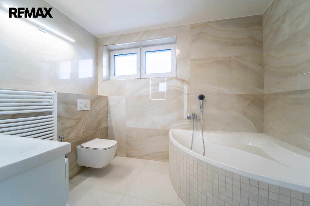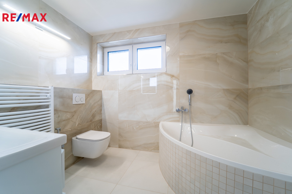 V patře jsou tři samostatné pokoje a koupelna s vanou a WC.