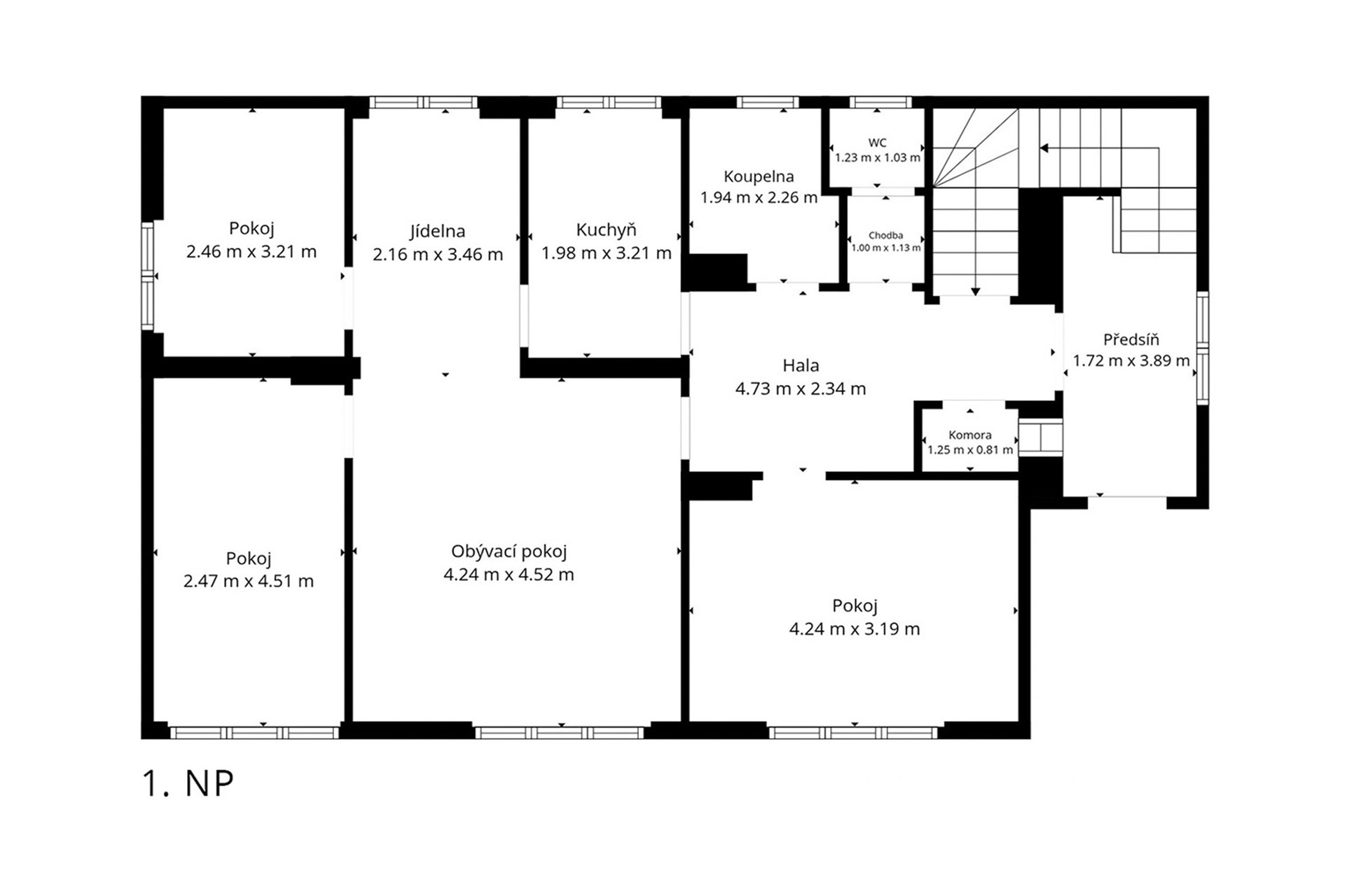 Do prvního nadzemního podlaží domu o dispozici 4+1 (86m2) se vstupuje po terasovém schodišti, kde se nachází společná chodba z které pokračuje schodiště do druhého nadzemního podlaží o dispozici 3+1 (81m2) z kterého se vstupuje na terasu (14m2). Vstup na půdu je z bytu v 2NP. Do podsklepené části domu vstupujete vnitřkem domu, garáží případně samostatným vstupem ze zahrady.