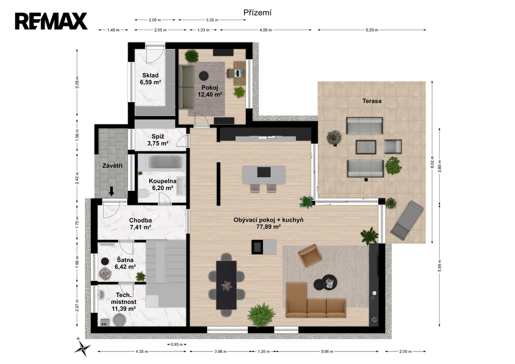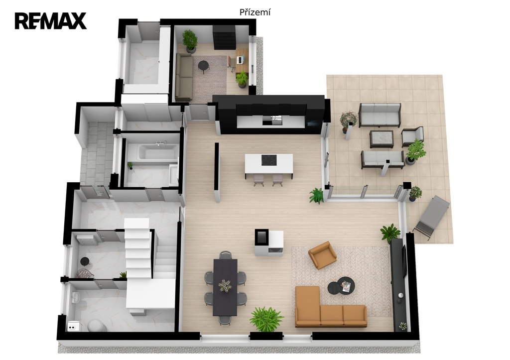 1NP: Chodba 7,5 m2, koupelna + WC 6,2 m2, spíž 3,75 m2, sklad 6,5 m2, pokoj 12,5 m2, obývací pokoj, s kuchyňským koutem 78 m2 a vstupem na terasu o výměře 25 m2, technická místnost 11,5 m2, šatna 6,5 m2.