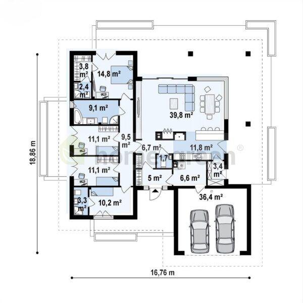 Navrhujeme na tomto pozemku postavit Z378 je moderní přízemní dům s vícepásmovou střechou a garáží pro dvě auta. Je dokončen v bílé omítce s rustikou, jemnou římsou a černým pohledovým betonem. Interiér domu je rozdělen na obývací a spací část. Prostorný obývací pokoj, který je propojen s elegantní jídelnou, je vybaven krbem, který zajišťuje, že váš domov bude vždy naplněn teplem domova. Kuchyňský kout je vybaven velkým množstvím pracovních desek (kuchyňský ostrůvek), které ocení každý majitel domu. Rozlehlá terasa obklopující celý obytný prostor je vybavena velkými okny pro maximalizaci vnitřního světla. Blízkost koupelny umožňuje hostům zůstat v obývacím prostoru. Ložnice se skládá ze čtyř pokojů, z nichž poslední má samostatnou koupelnu a šatnu, takže ji lze využít jako pokoj pro hosty nebo jako hlavní ložnici. Dva prostřední pokoje mají společnou koupelnu na chodbě, zatímco pokoj s výhledem do ulice má vlastní koupelnu. Návrh domu Z378 vznikl jako reakce na potřeby rodin se třemi dětmi.