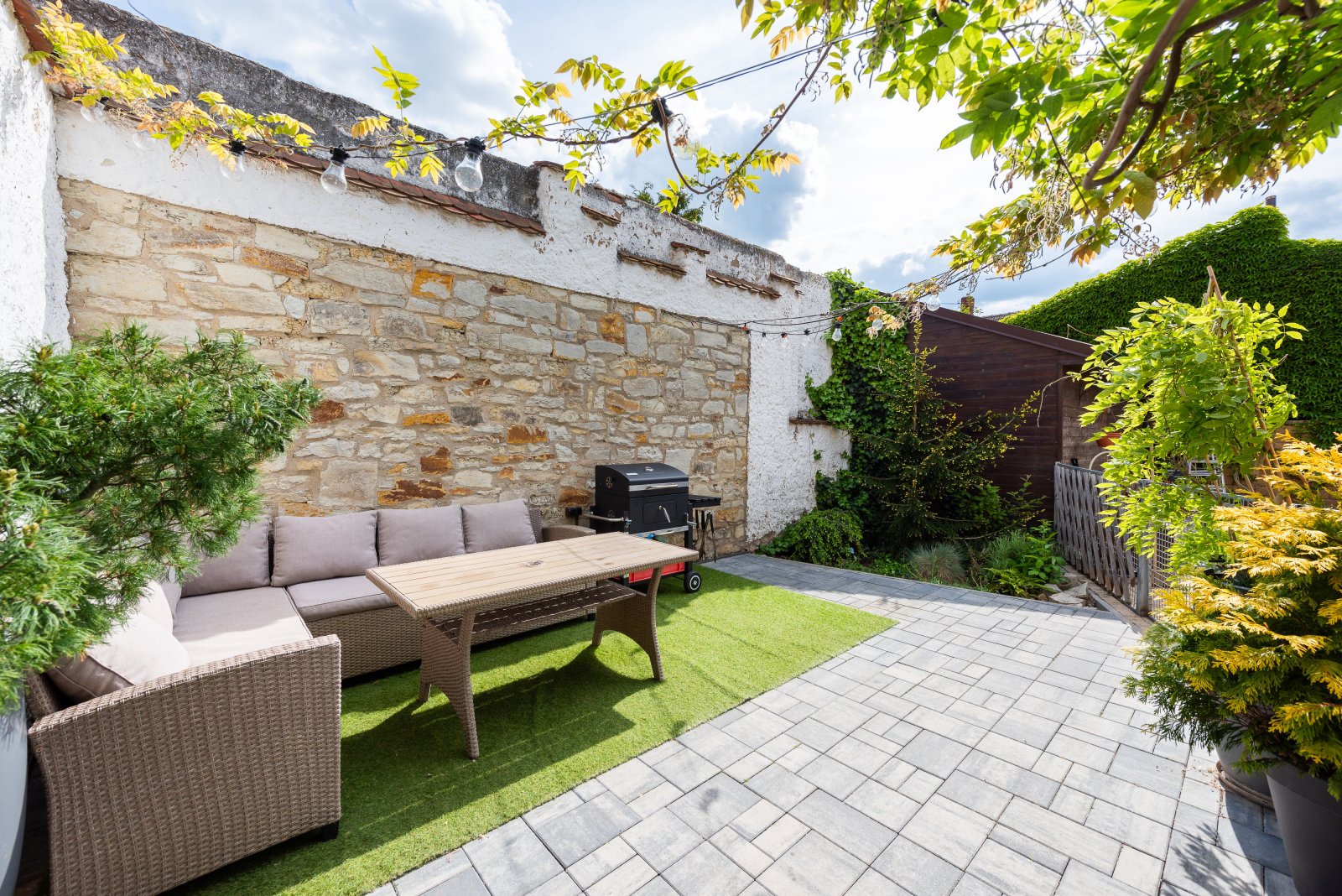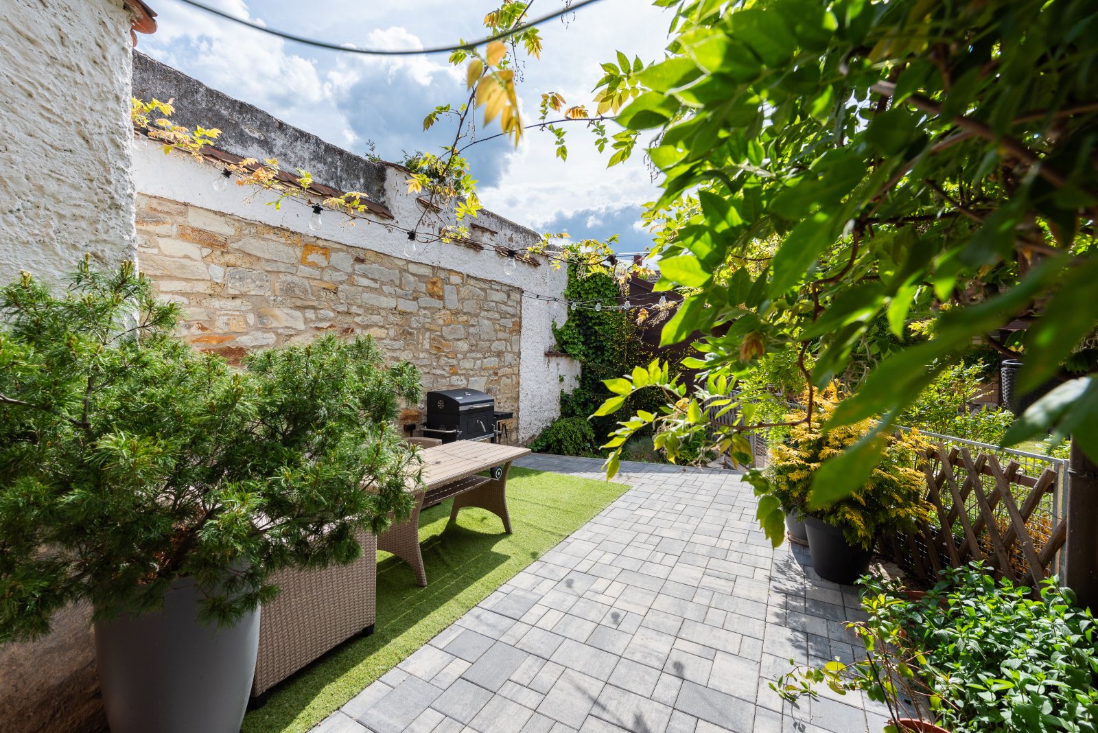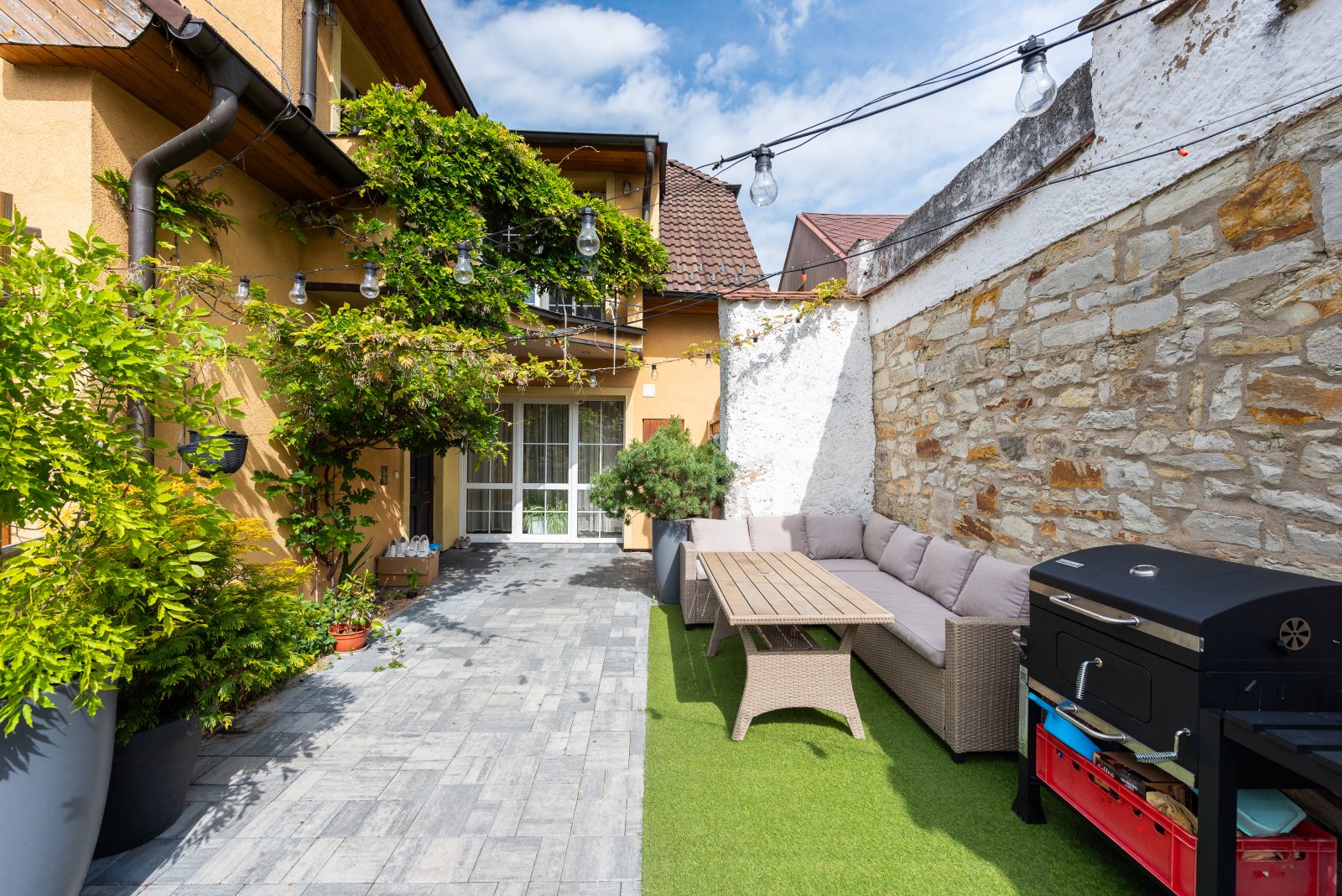 Na pozemku o rozloze 282m2 vznikla příjemná zahrada rozdělená do několika fungujících prostorů. Po levé straně je příjemné posezení, po pravé straně se nachází zahrada ideální pro vyžití s dětmi. Zahrada je zatravněna, je zde i pár stromků a k zalévání můžete používat dešťovou vodu.