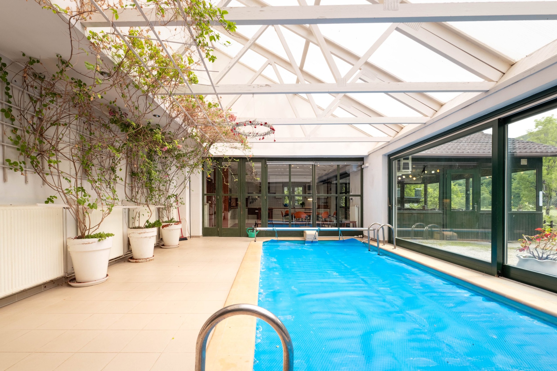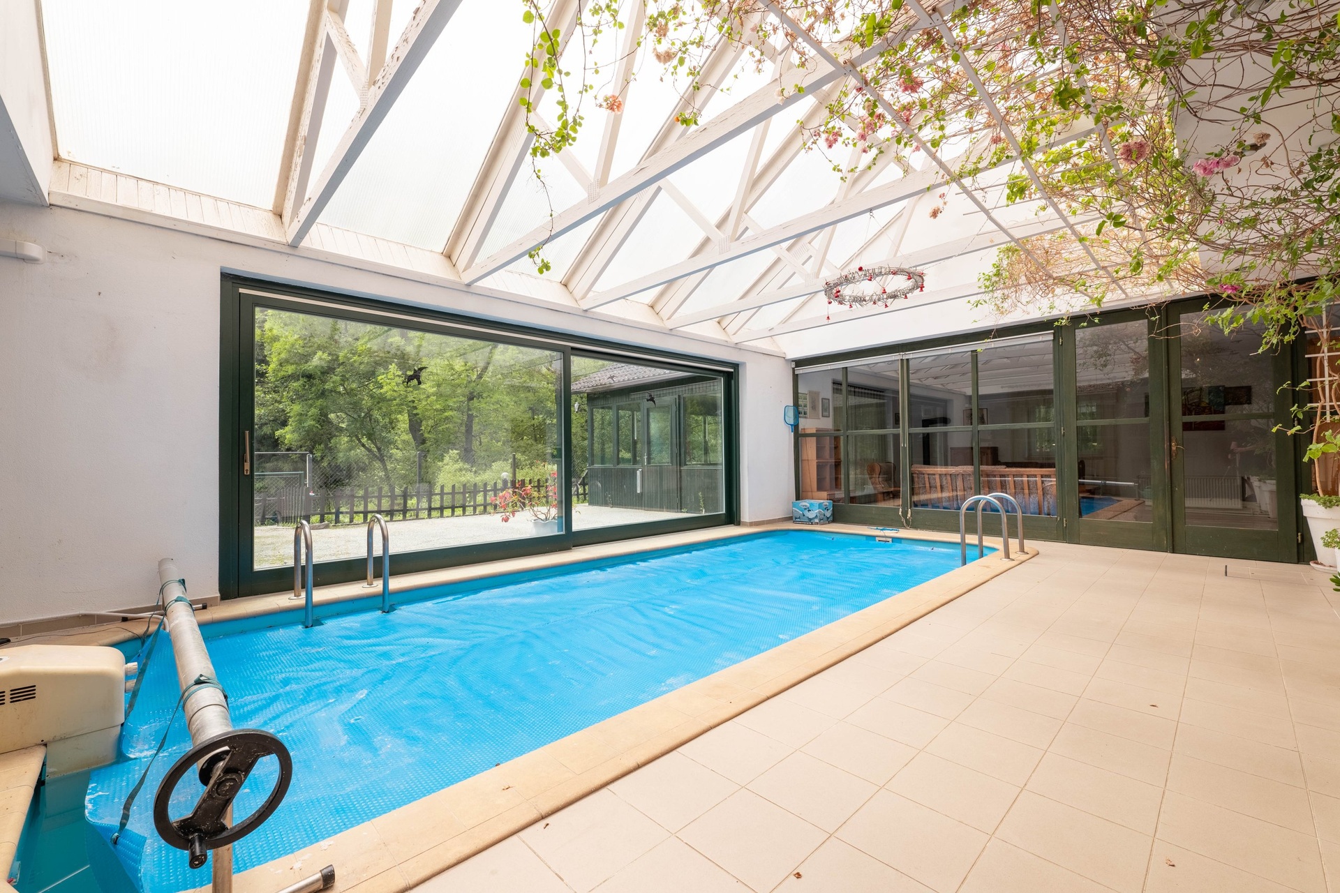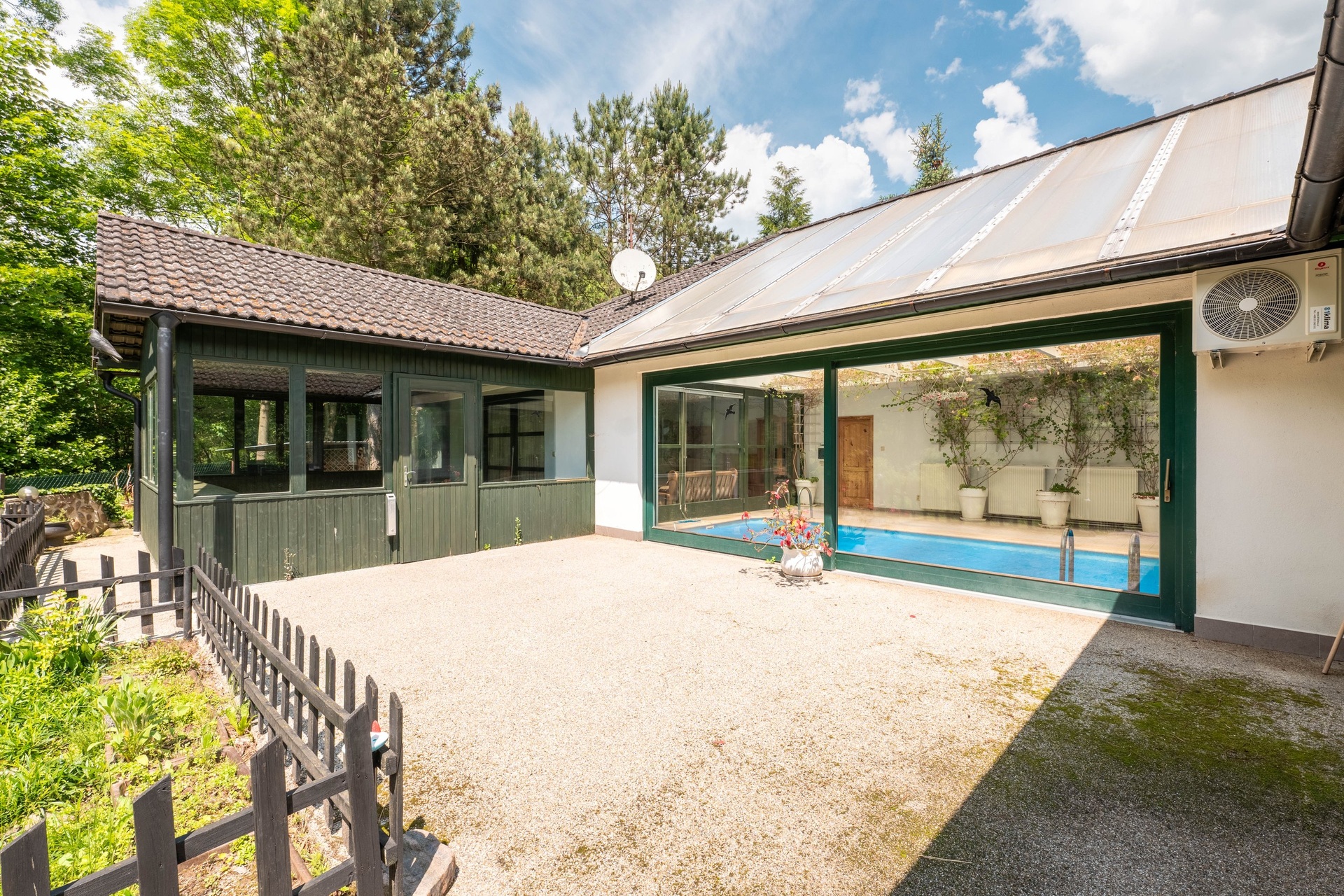 Hlavní dům disponuje třemi pokoji, kuchyní, společenskou místností a bazénovou halou. Je zde také možnost rozšíření o půdní vestavbu. Dále se na pozemku se nacházejí dva hostinské domy. První dům má dispozici 2+kk s vlastním sociálním zařízením, dílnou a černou kuchyní/přípravnou. Druhý nabízí dva pokoje a koupelnu s WC. Další vybavení zahrnuje stylové kryté posezení s krbem, grilem a udírnou. Samozřejmostí je kryté parkovací stání pro více aut a dále skleník.