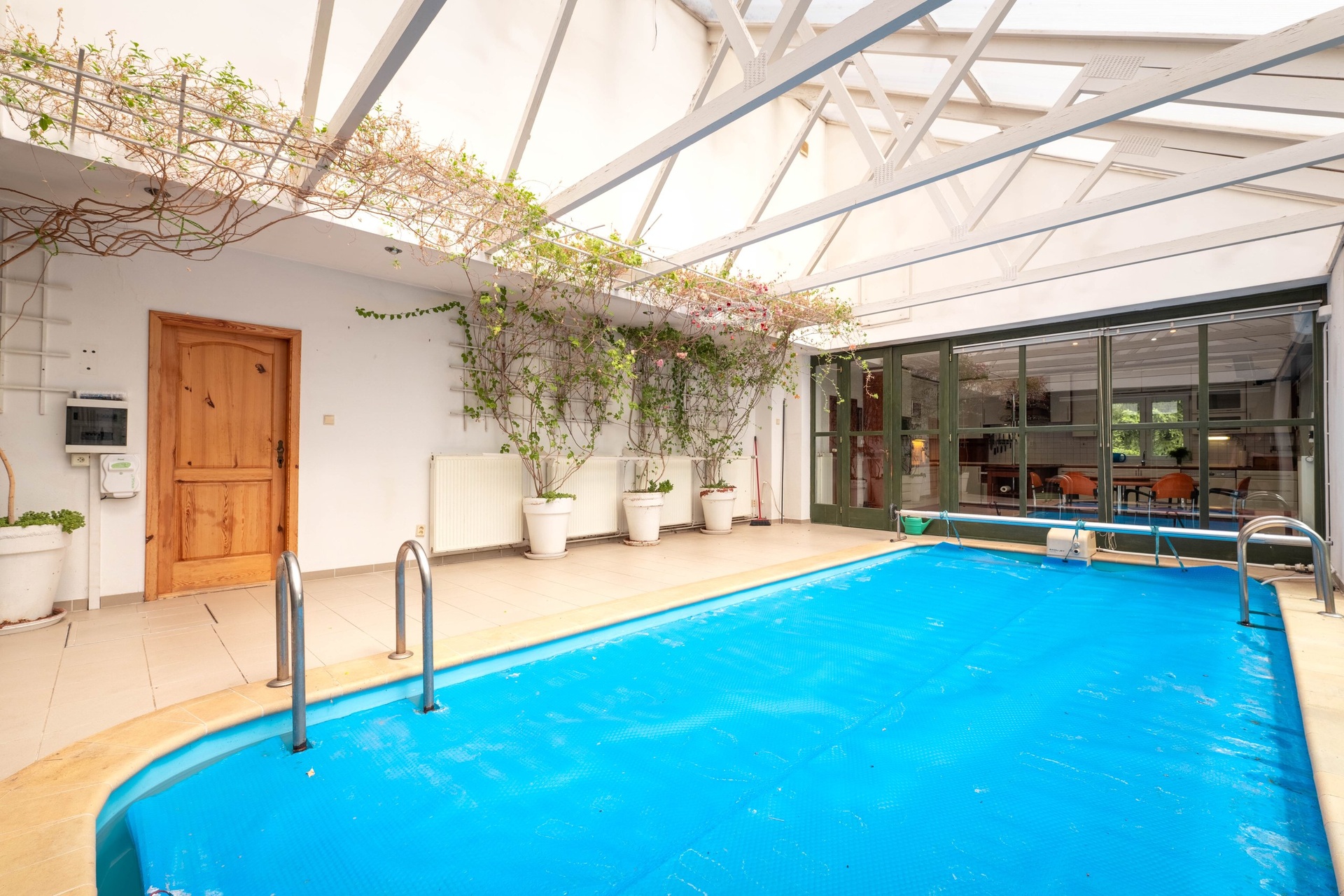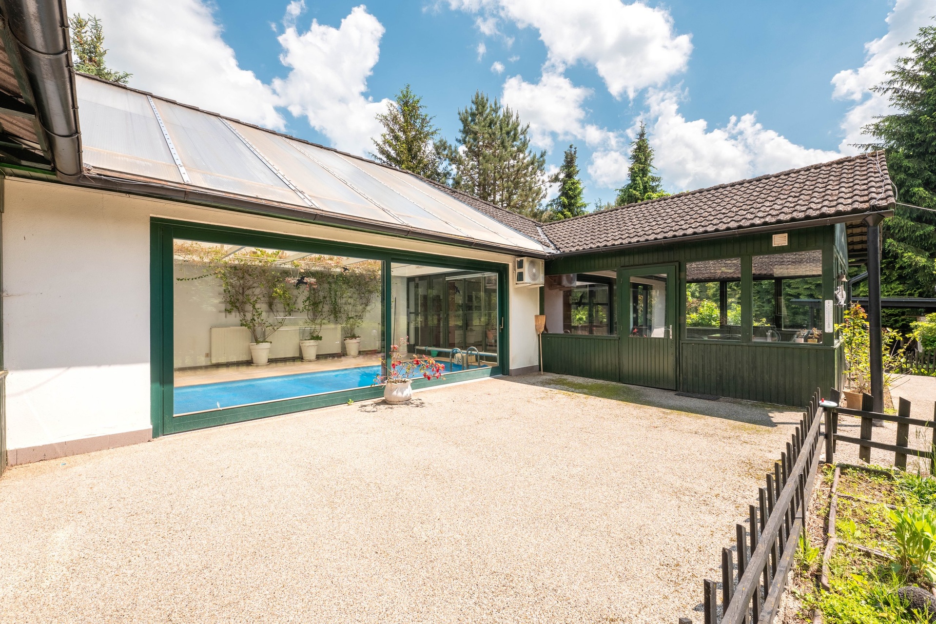 Rodinný dům: obytná veranda (24,5 m²), kuchyně s jídelnou (25,5 m²), obývací pokoj (28,5 m²), společenská místnost (24,5 m²), bazénová hala (45,0 m²), chodba (2,5 m²), koupelna s WC (15,0 m²), ložnice (21,0 m²), ložnice (20,0 m²), chodba (3,4 m²), koupelna s WC (2,5 m²), komora (3,0 m²)