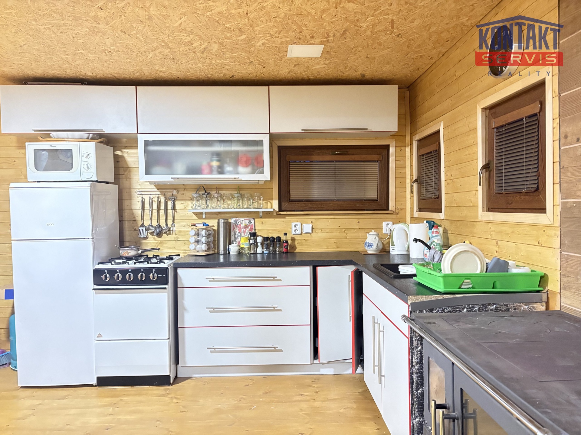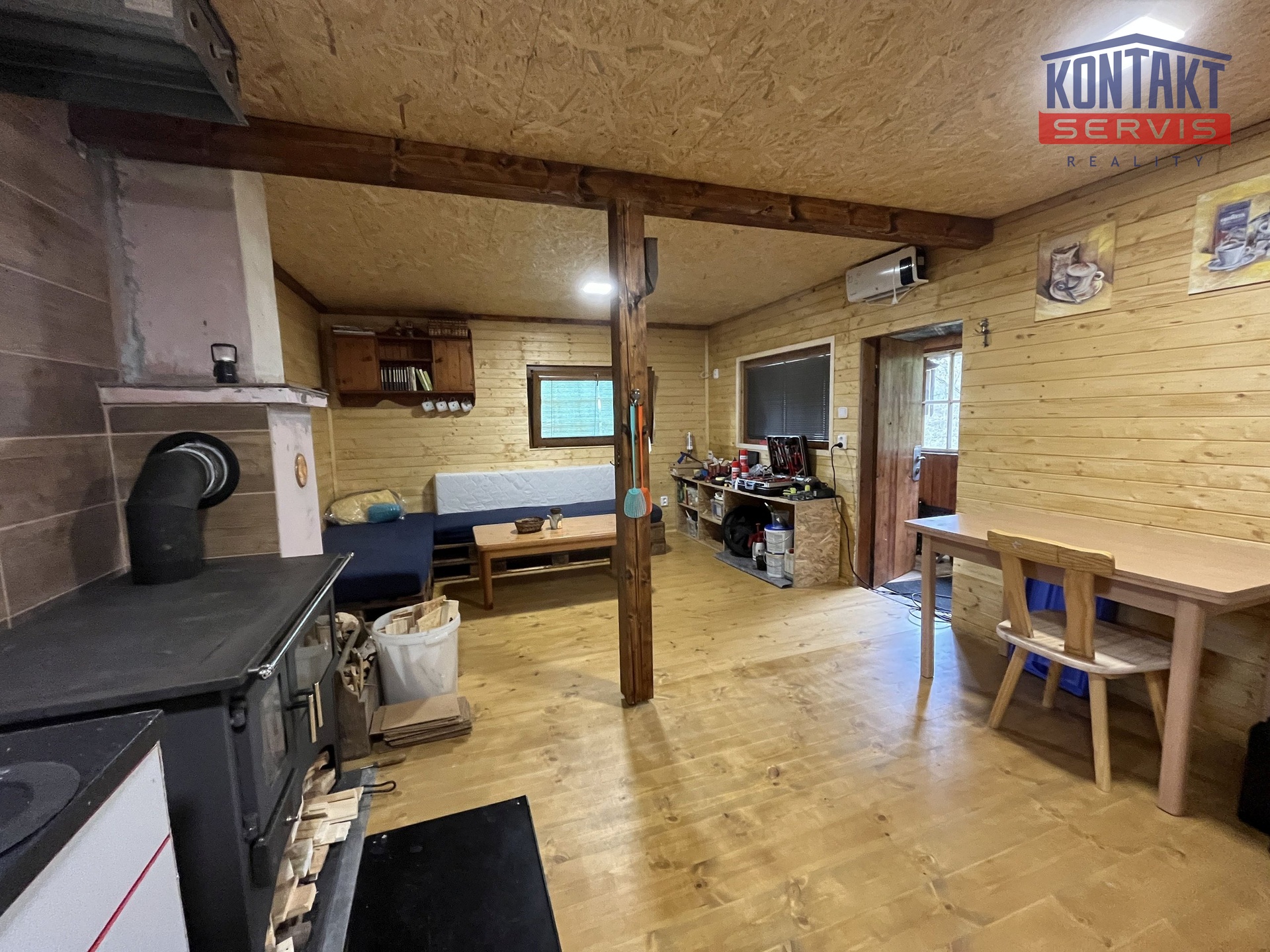 Hlavní obytná místnost s kuchyňským koutem, gaučem a kamny má podlahovou plochu 24 m2.