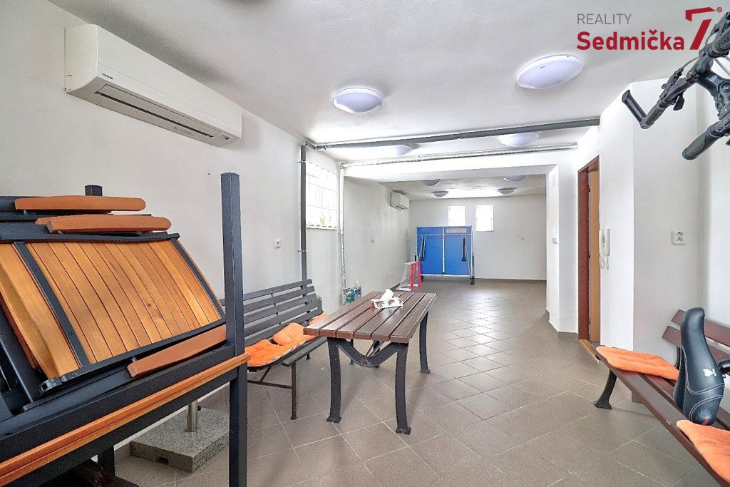 K bytu náleží prostorný sklep s regály. V domě je navíc připraveno zázemí pro aktivní život – držáky na kola, stojany na lyže a společenská místnost, kterou lze využít jak pro sportovní aktivity, tak i pro setkávání nebo oslavy.