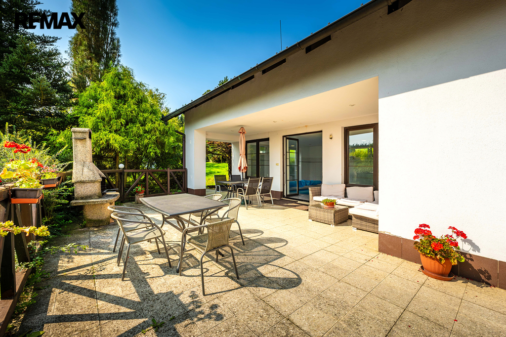 Velká terasa s grilem, posezením a elektrickým připojením (včetně místa na ledničku)