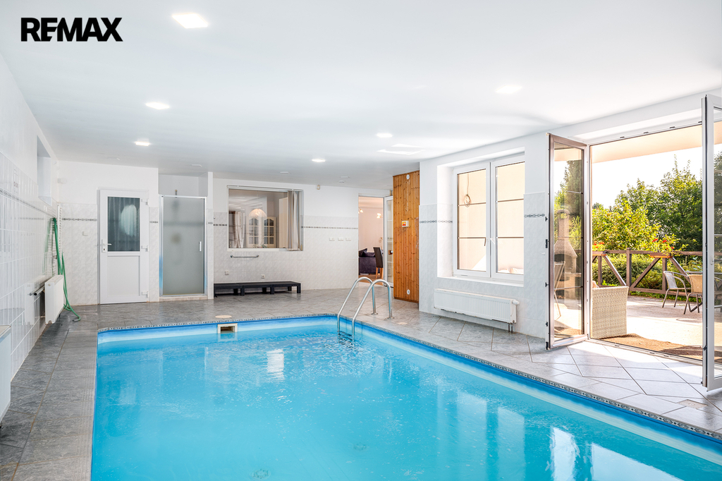 Vnitřní bazén (7 × 3,5 m) s ohřevem vody nad 30 °C a relaxační wellness místností