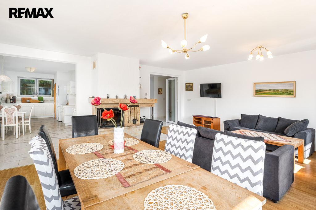 Velkorysý obývací prostor s kuchyní, jídelním koutem a vstupem na terasu