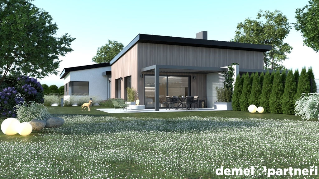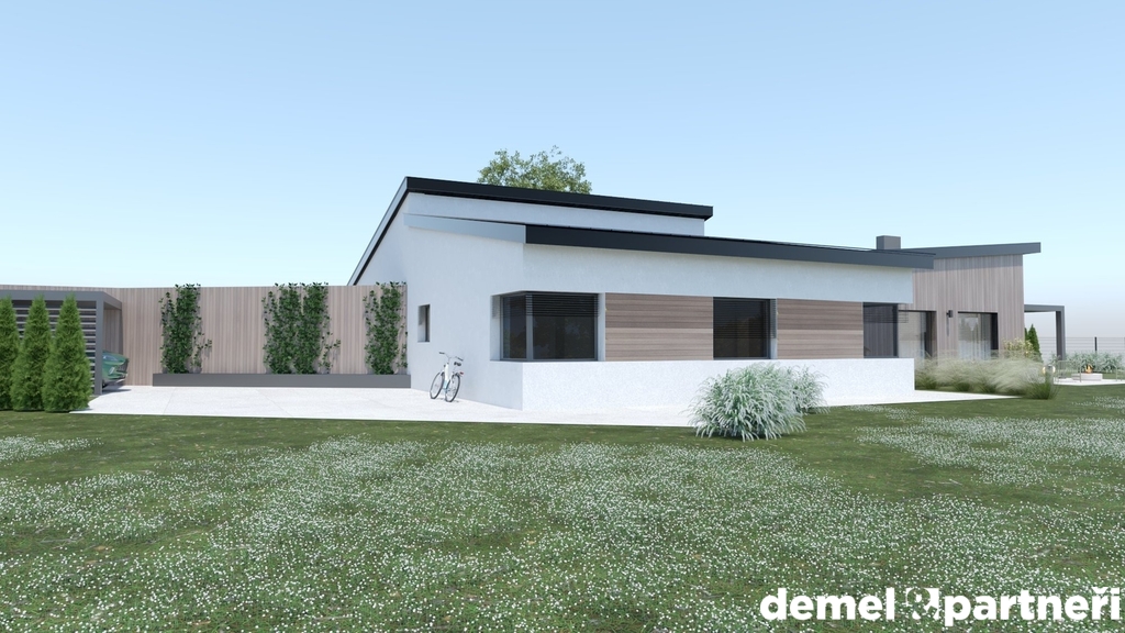 Obrovskou výhodou domu je, že je přízemní. Takže žádné schody, žádné zvýšené náklady na vytápění. Dalším plusem je, že v rámci příplatků si můžeš objednat bioklimatickou pergolu, kryté garážové stání, venkovní žaluzie, klimatizaci, fotovoltaiku, kamery, ale i zabezpečovačku. Prostě vše co se dá dneska vymyslet. Celkově tedy půjde o velmi moderní bydlení s moderními technologiemi.