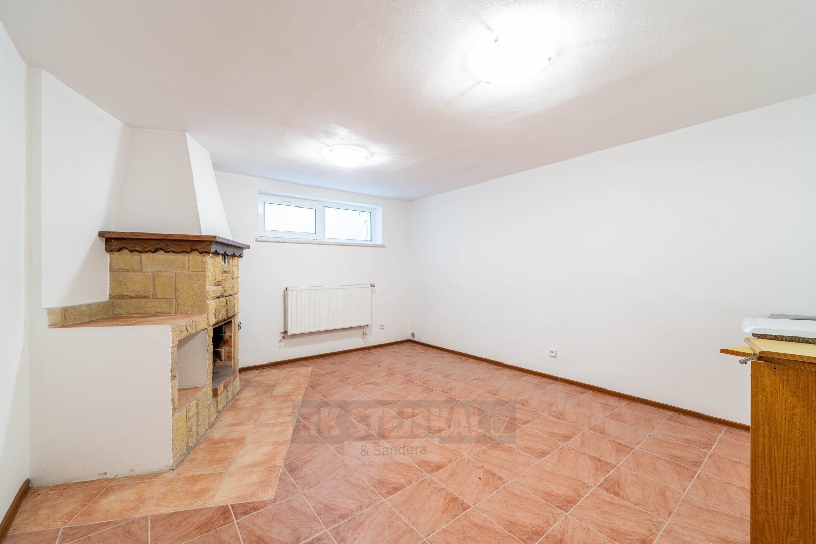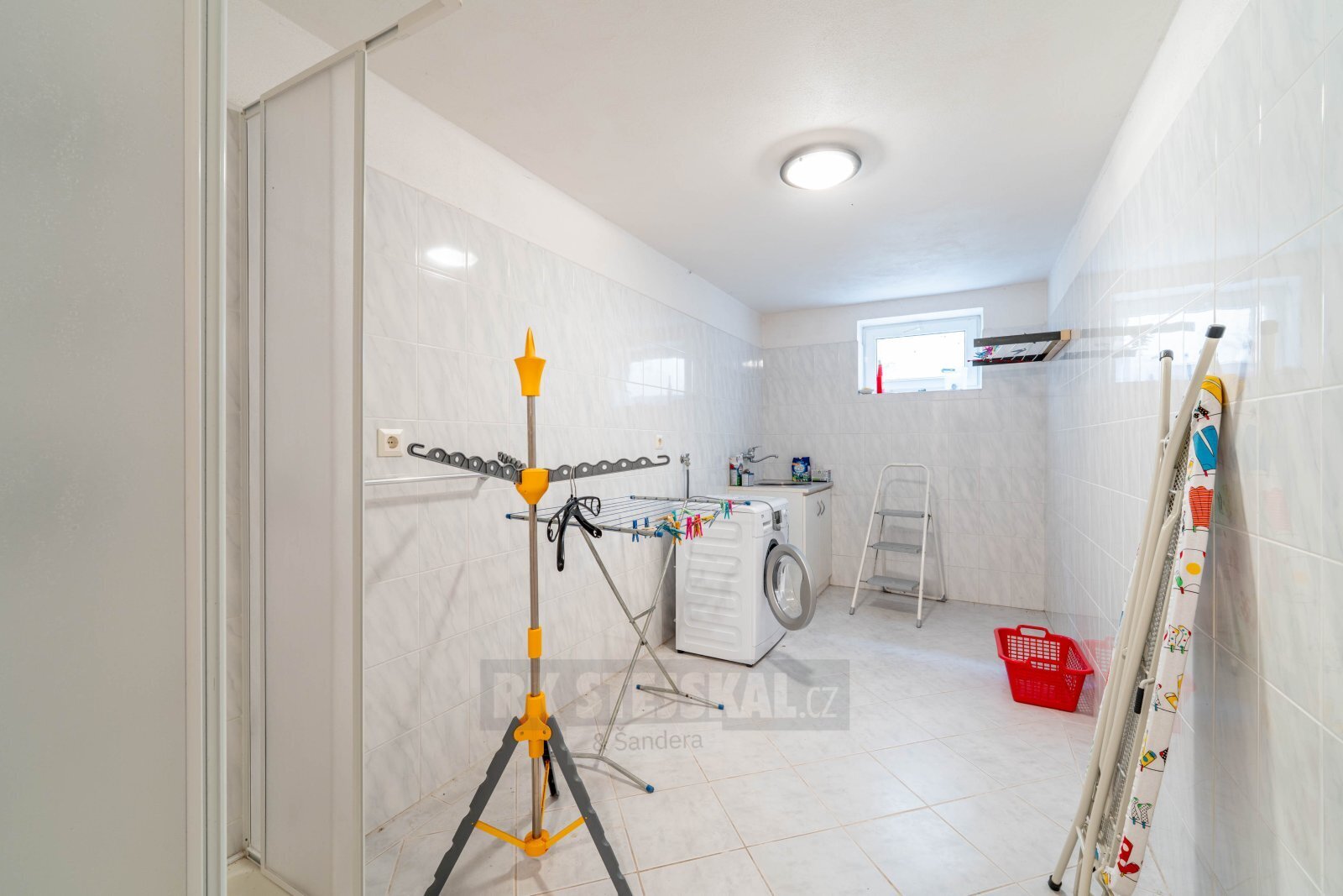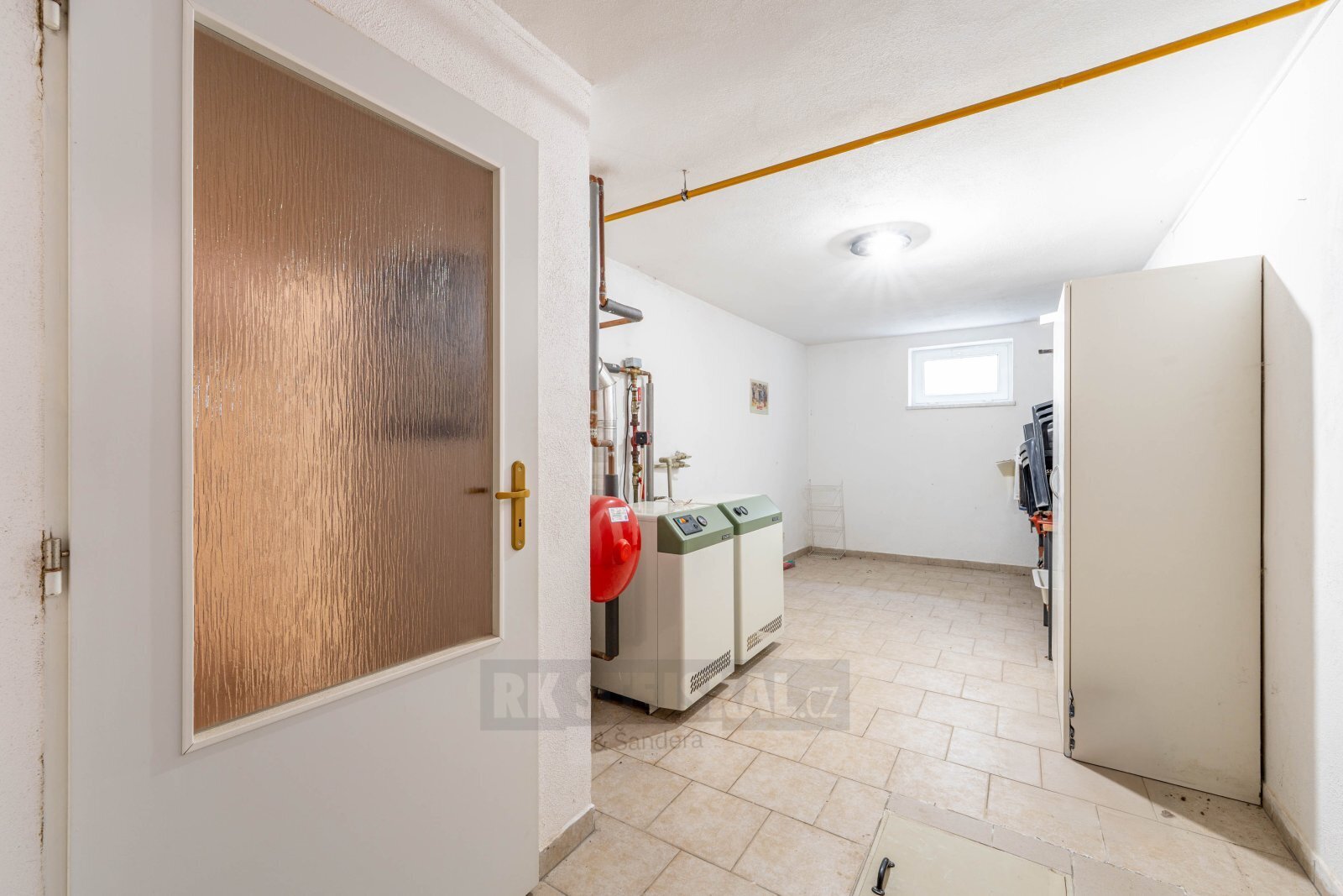 suterén – středová chodba, samostatný obytný pokoj s krbem a s kuchyňským koutem, samostatná ložnice, prostorná koupelna (prádelna) se sprchovým koutem, s umyvadlem, s WC a prostorem pro pračku a sušičku, skladová místnost bez okna, technická místnost s plynovými kotli (topení/ohřev vody) a skladovým prostorem.