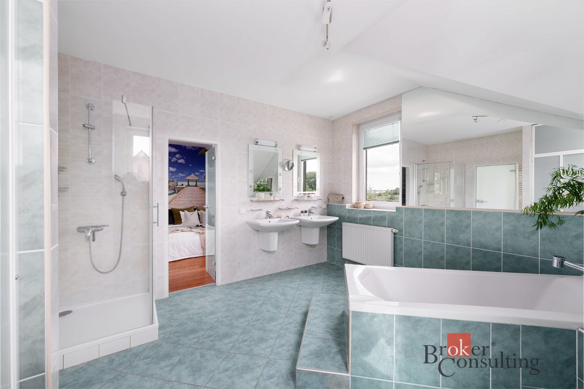 - Koupelna se sprchovým koutem, vanou a dvěma umyvadly