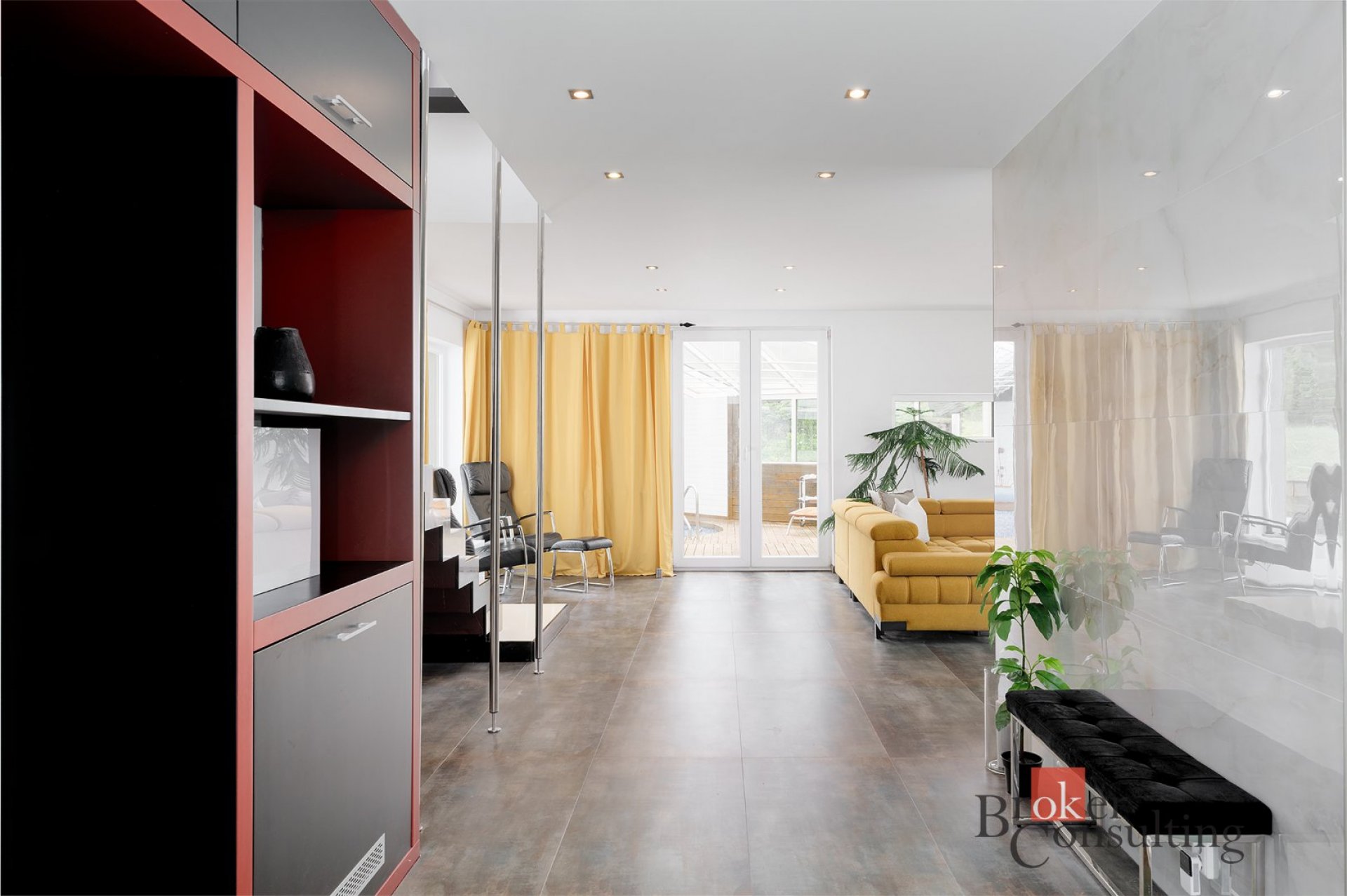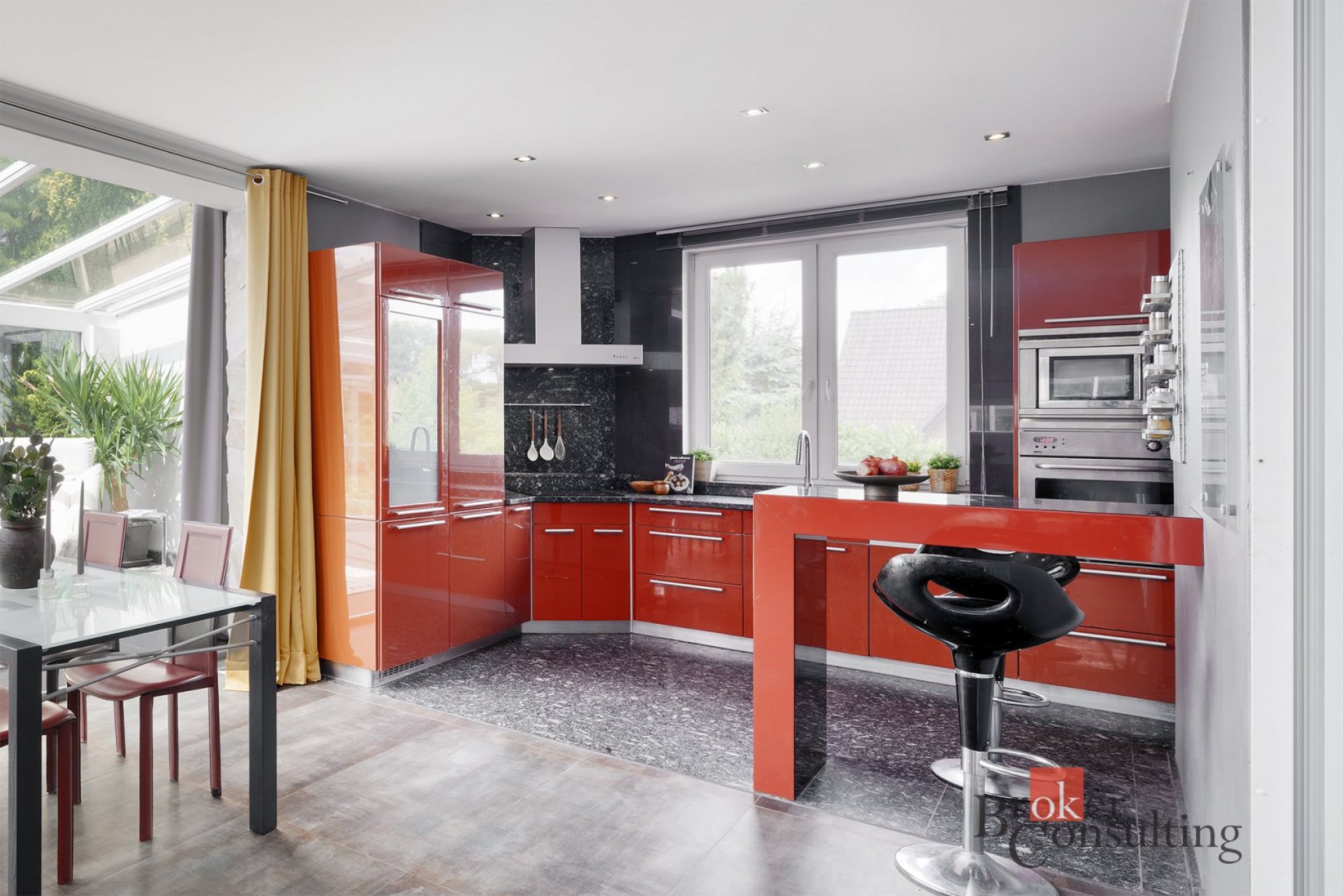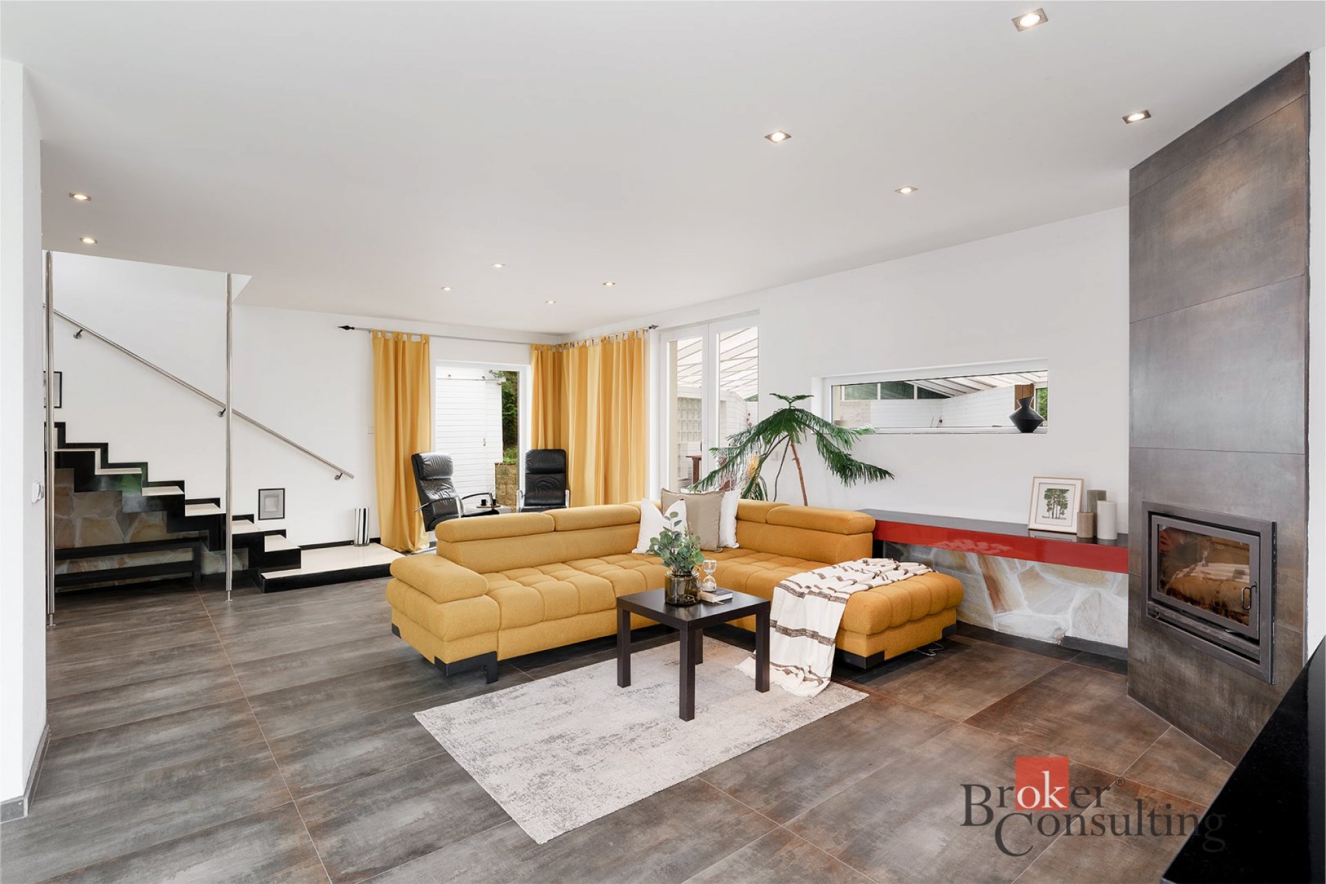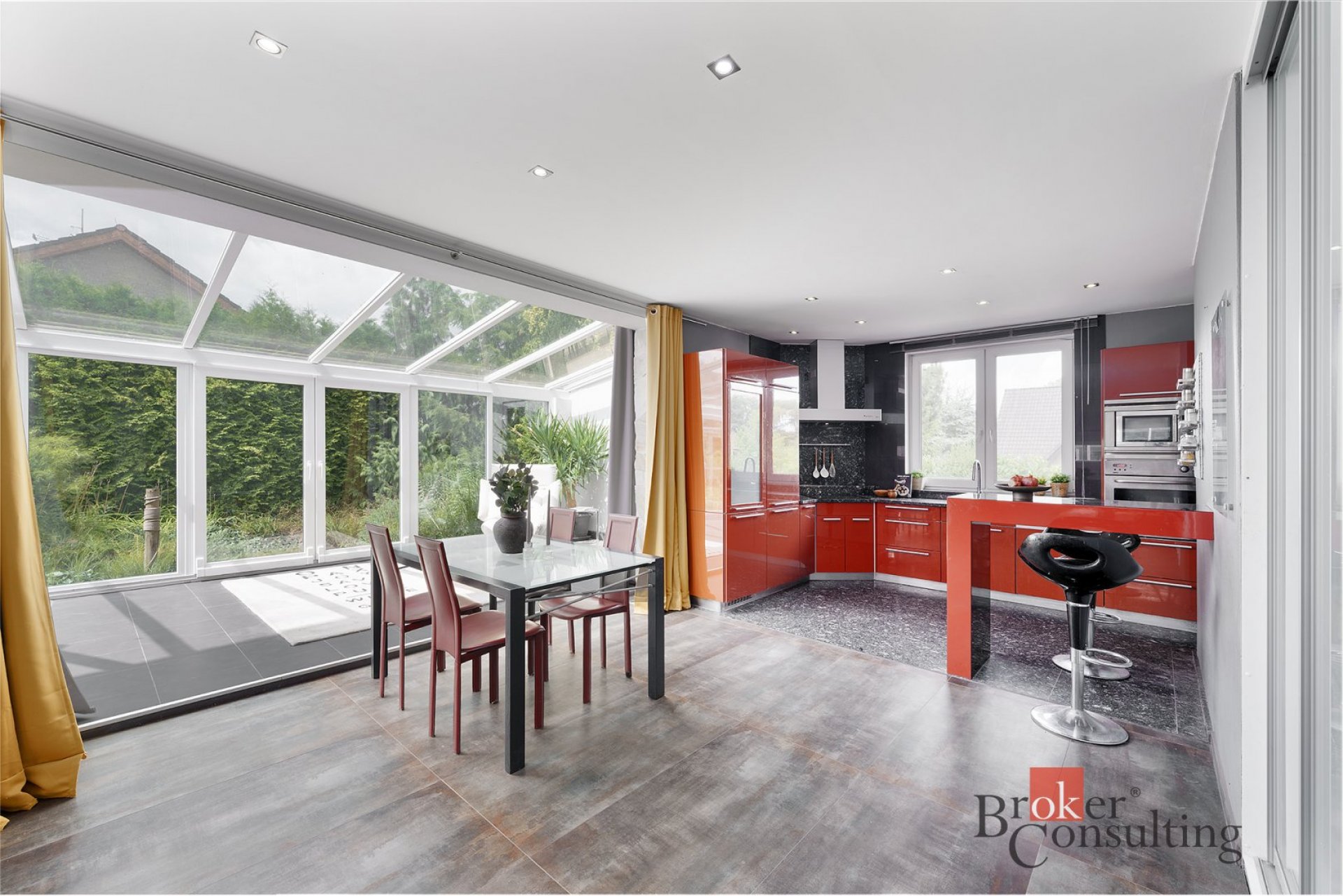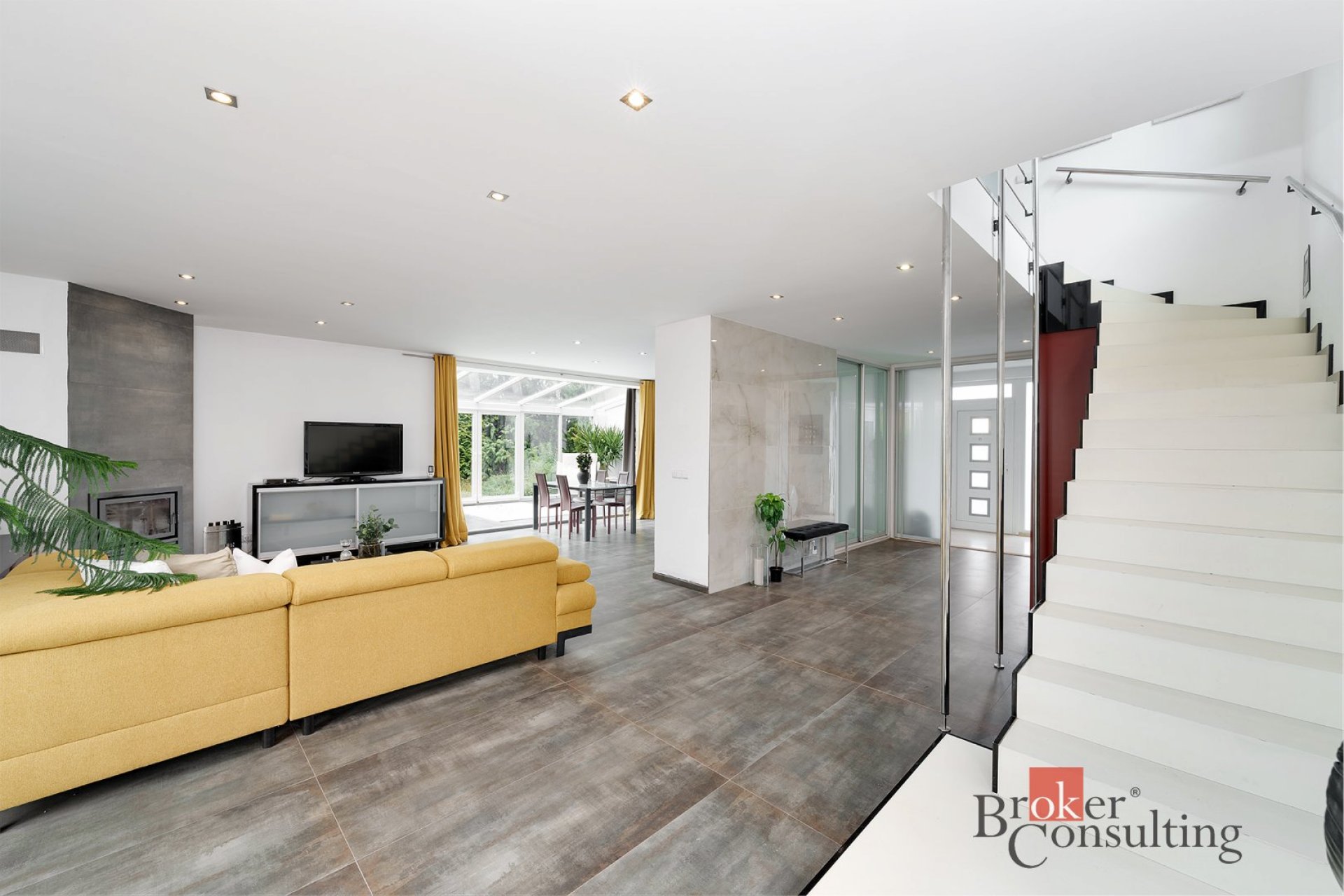 - Prostorný obývací pokoj spojený s kuchyní a zimní zahradou