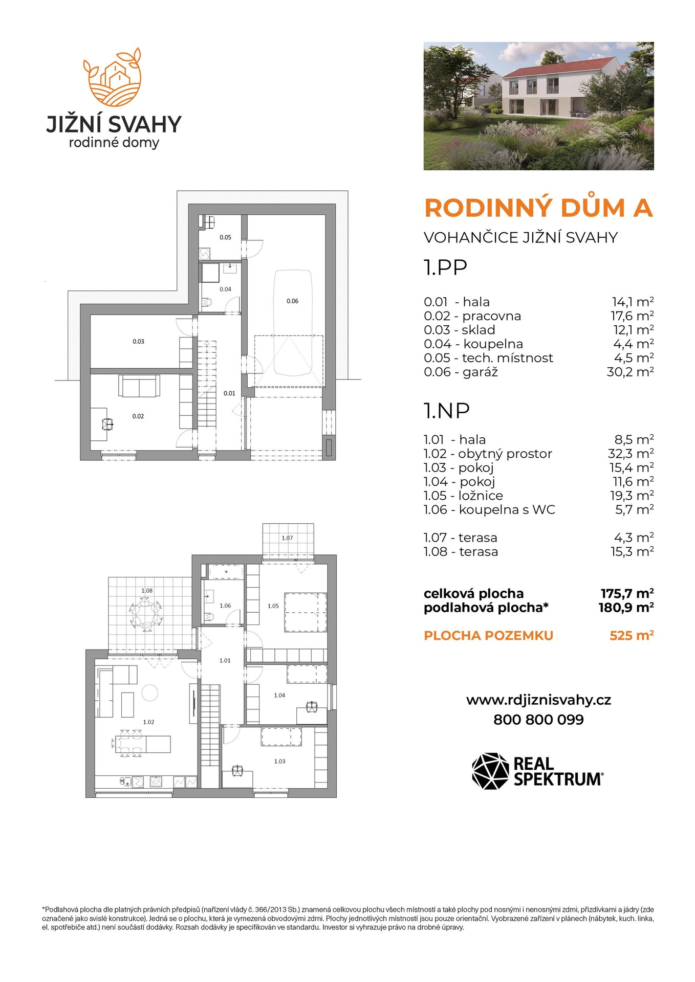 1.PP: hala (14,1 m²), pracovna (17,6 m²), sklad (12,1 m²), koupelna (4,4 m²), technická místnost (4,5 m²), garáž (30,2 m²)