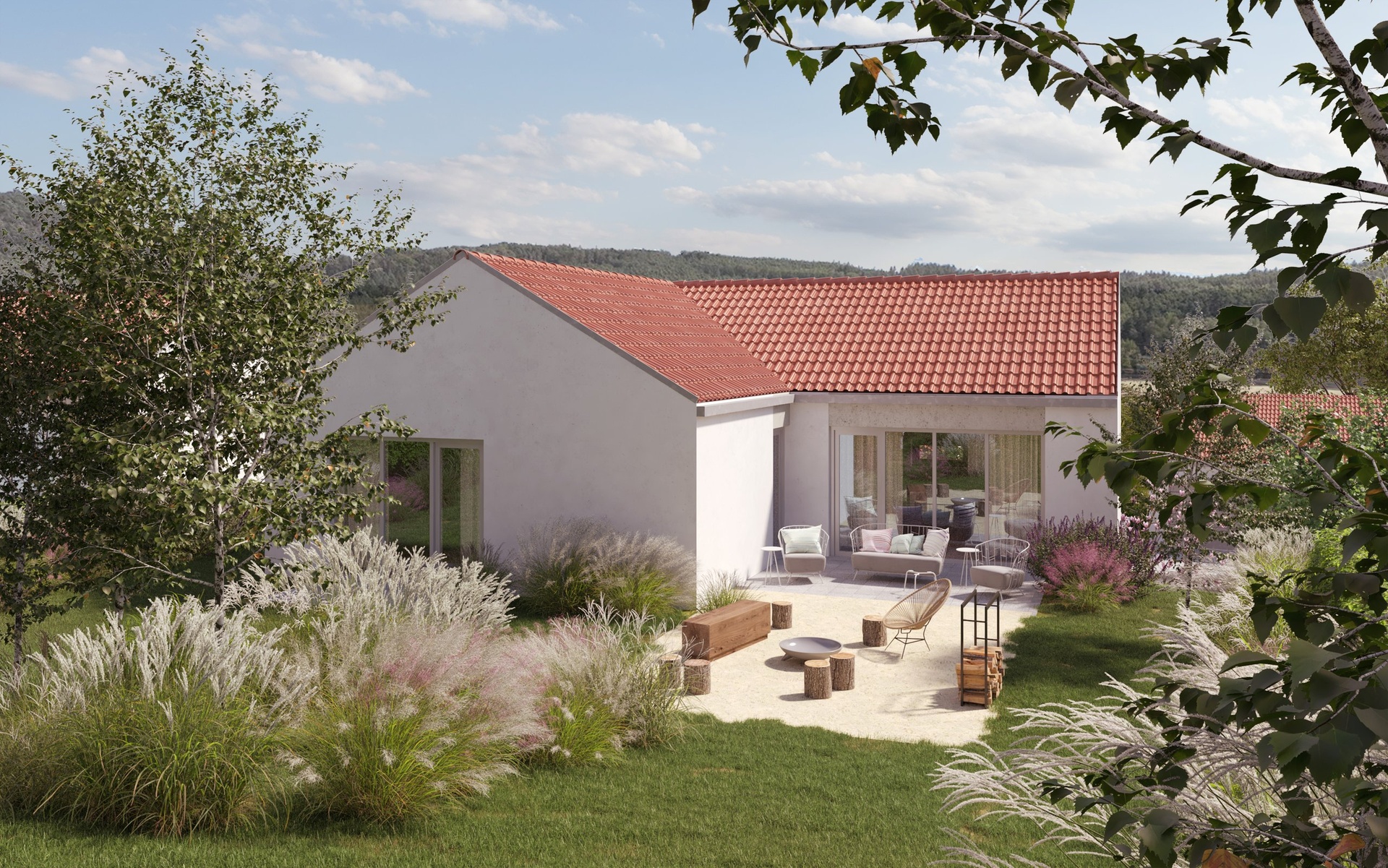 1.NP: hala (8,5 m²), obývací pokoj s kuchyňským koutem (32,3 m²) a vstupem na terasu (15,3 m²), pokoj (15,4 m²), pokoj (11,6 m²), ložnice (19,3 m²) s terasou (4,3 m²), koupelna s WC (5,7 m²)