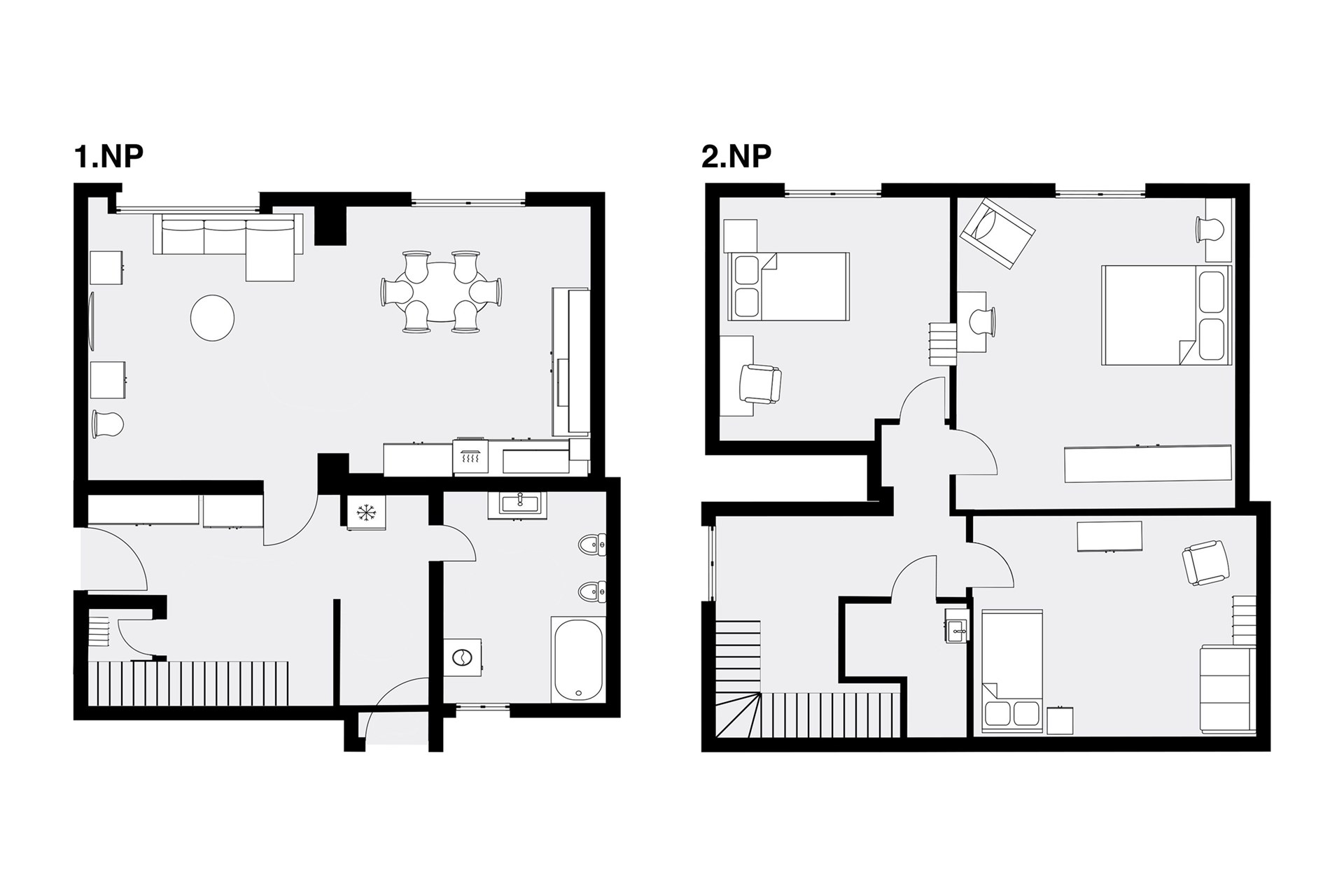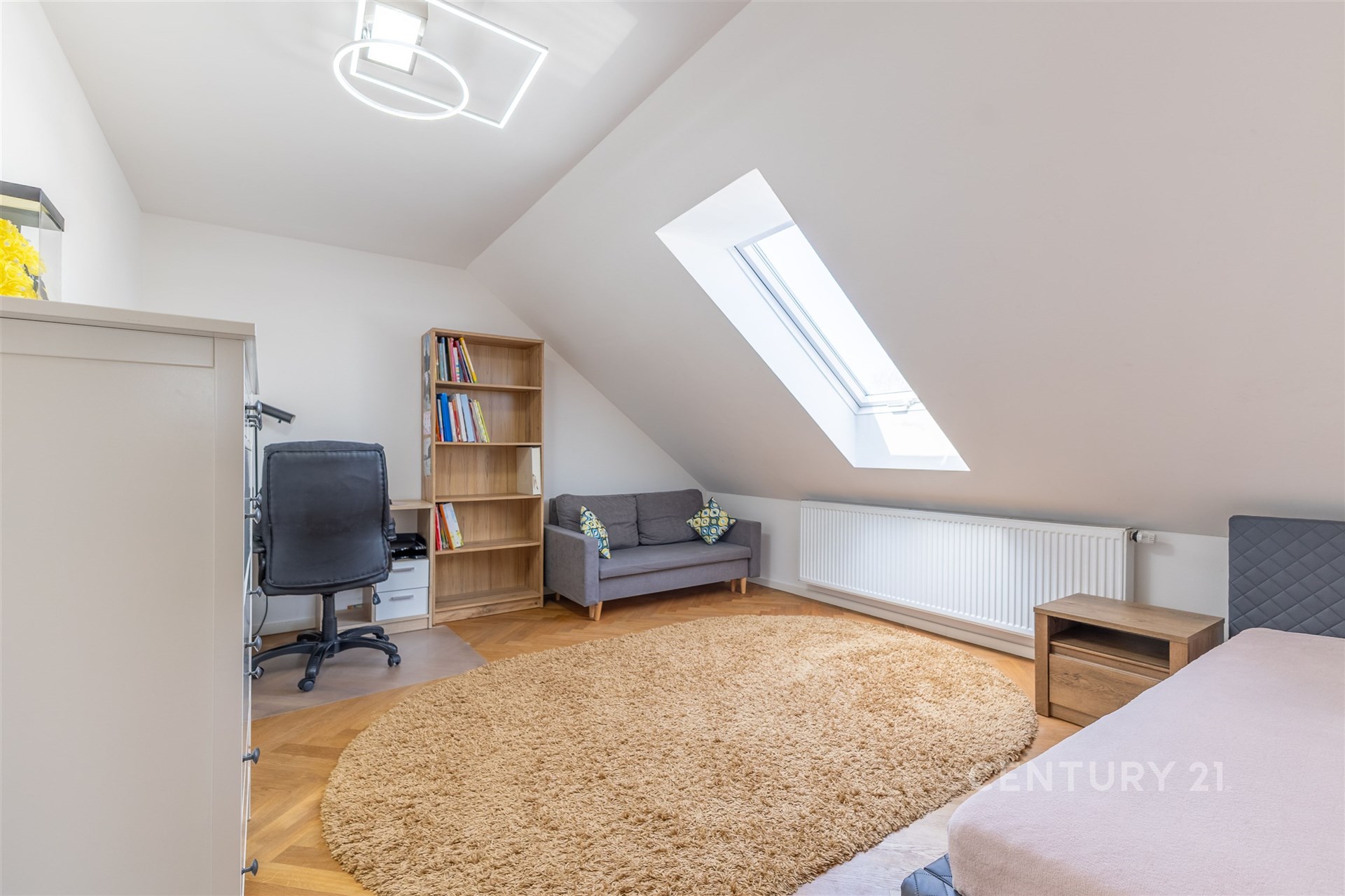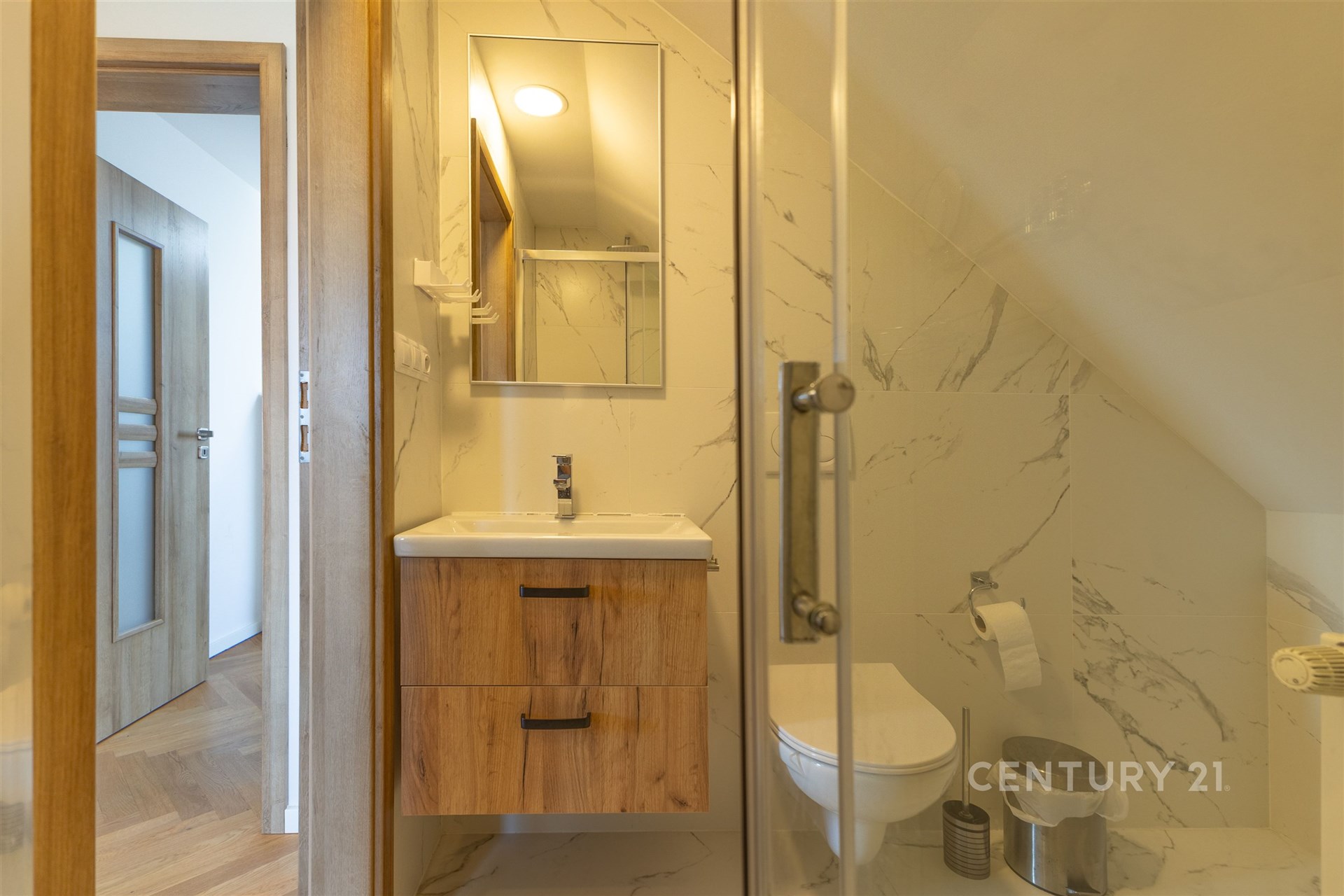Privátní zóna domu se nachází v horním patře, kde jsou situovány dva světlé dětské pokoje a hlavní ložnice vybavená praktickou skříní. Velkou předností domu je existence dvou koupelen. Zatímco v horním patře naleznete menší koupelnu se sprchovým koutem a toaletou, v přízemí se nachází hlavní rodinná koupelna s prostornou vanou, velkým umyvadlem a dedikovaným místem pro pračku i sušičku. Celý dům je částečně podsklepen, což nabízí další cenné úložné prostory k již tak velkorysé dispozici dvou nadzemních podlaží.
