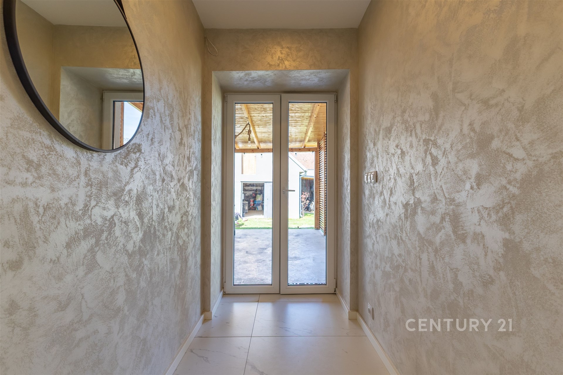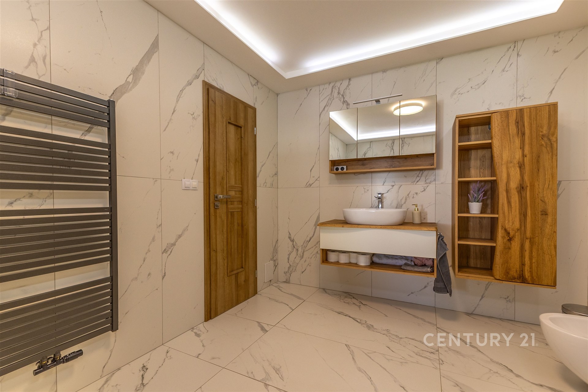 Interiér domu byl navržen s maximálním důrazem na detail a kvalitu použitých materiálů, což pocítíte hned při prvním vstupu. Celým obytným prostorem procházejí luxusní dřevěné parketové podlahy, které harmonicky doplňují vstupní halu a koupelny s velkoformátovou dlažbou a obklady v elegantním mramorovém dekoru. Srdcem přízemí je velkorysý obývací pokoj propojený s jídelní částí a moderní kuchyní. Kuchyňská linka je vybavena špičkovými vestavěnými spotřebiči, plynovým sporákem a designovou digestoří. Atmosféru prostoru dotvářejí stylové betonové stěrky na stěnách a promyšlené podsvícení stropů, které spolu s designovými svítidly vytvářejí jedinečný estetický zážitek.