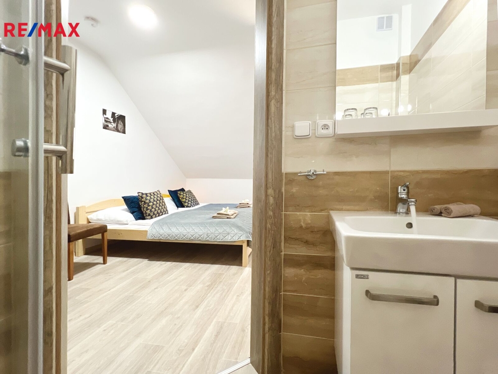 V patře se dále nachází samostatný apartmán o dvou pokojích opět s vlastní koupelnou se sprchovým koutem a odděleným WC. Prostor galerie je momentálně využitý jako dětský pokoj. Pro nové využití se nabízí jako společenská místnost, relax zona, nebo kinosál.