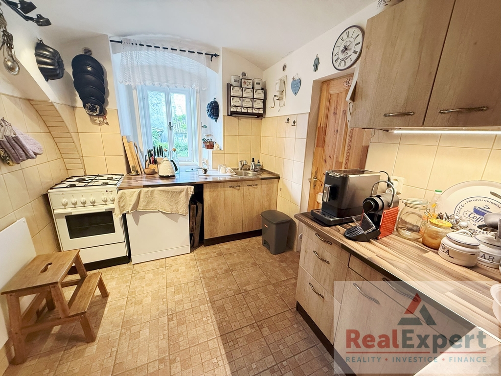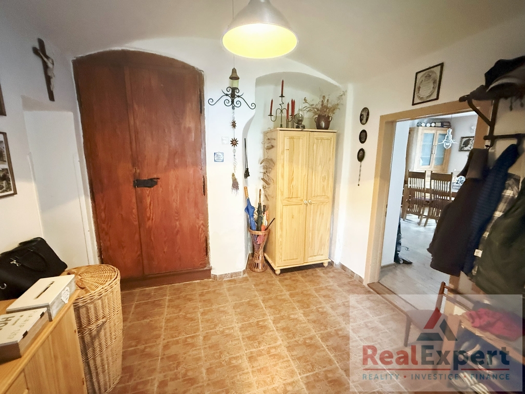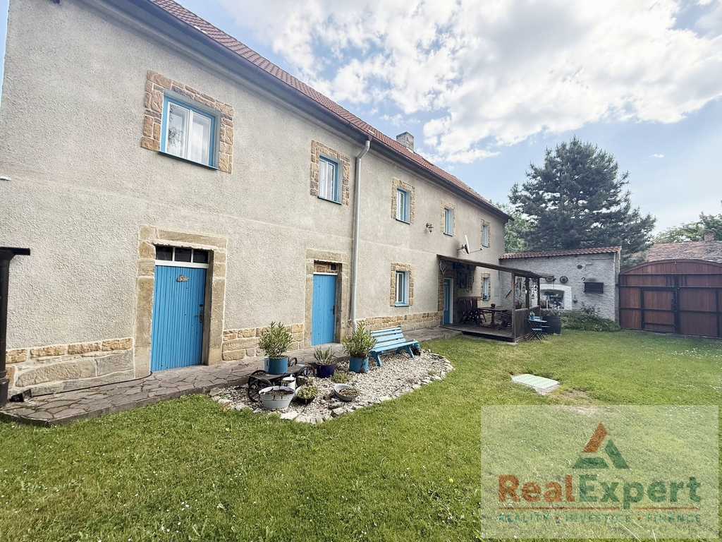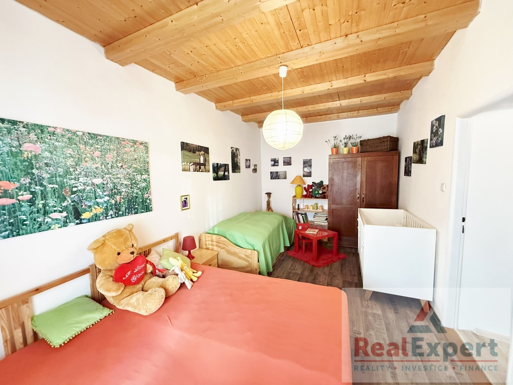Dvoupodlažní dům o dispozičním řešení 5+1 (zastavěná plocha 19,5 x 6,8 m), s užitnou plochou cca 200 m² (+prostorná půda) a tradiční architekturou prošel v minulých letech citlivou rekonstrukcí, která zachovala původní ráz stavby. Najdete zde 4 prostorné pokoje (ložnice), stylový obývací prostor s jídelnou a krbovými kamny, vybavenou kuchyni, koupelnu a WC. Interiér spojuje přirozené materiály a moderní pohodlí – dřevěné podlahy, dekorativní trámy i výhled do zeleně. K dispozici je dále dílna, sklípek a garáž (6x3 m)