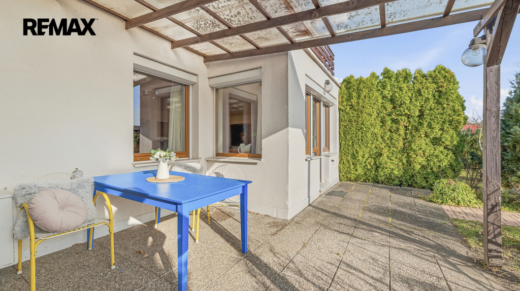Na obytnou část navazuje prostorná terasa orientovaná do zahrady, která nabízí ideální místo pro ranní kávu, letní posezení i rodinná setkání.