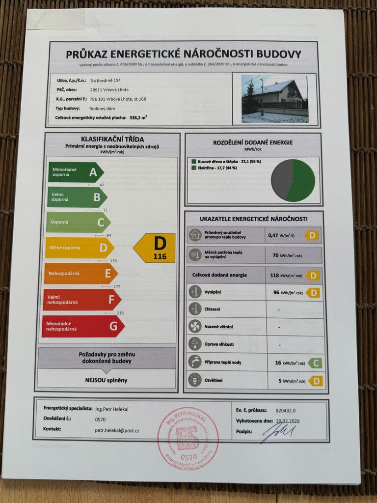 - Ukazatel energetické náročnosti budovy: 116 kWh/m²