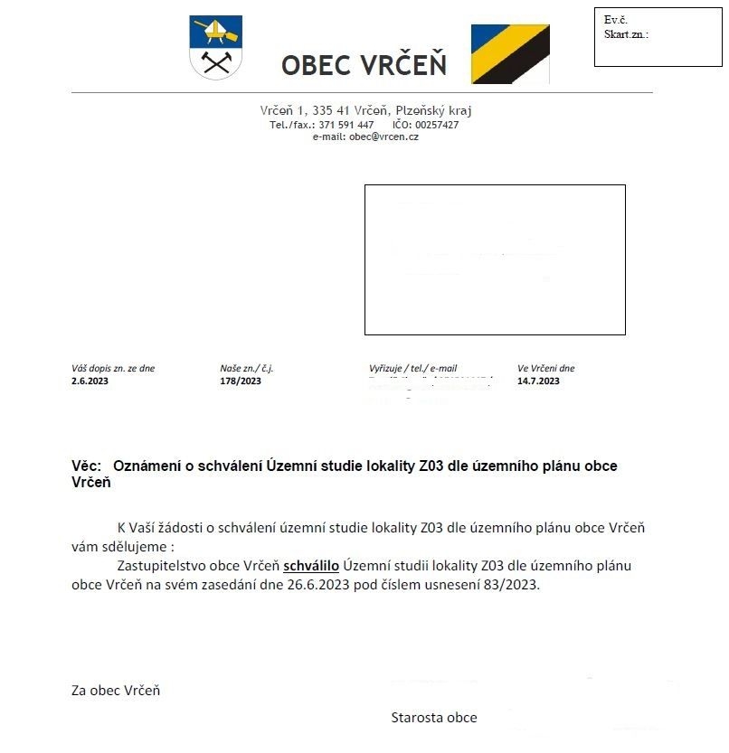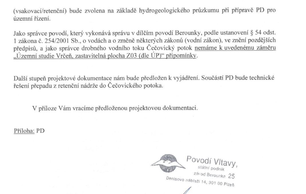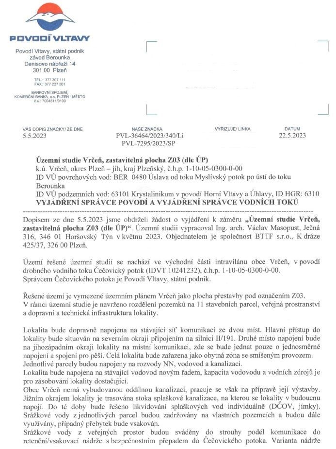 V lokalitě již byla zpracována územní studie, která je schválená zastupitelstvem obce. Dále pak stanovisko Povodí Vltavy a vyjádření od Kanalizace a Vodovody Starý Plzenec a.s., ohledně dostatečné kapacity vodovodu.
