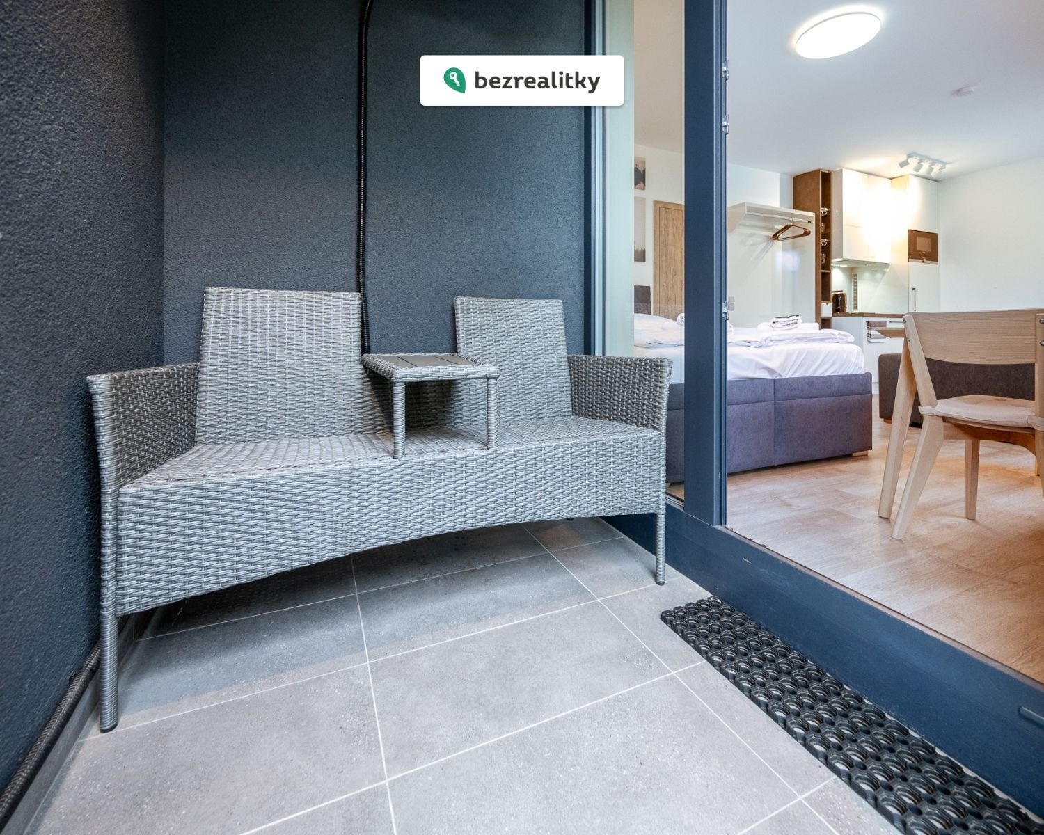 Apartmán v novostavbě s praktickým designovým vybavením na míru. Před domem společné ohniště a dětské prolézačky.