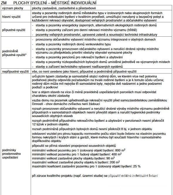 Podle platného územního plánu je parcela zařazena do zóny městského individuálního bydlení, což umožňuje výstavbu rodinného domu městského typu. Zajímavostí této lokality je povolení výstavby domů s terasovitým členěním střech, případně s plochou či pultovou střechou.