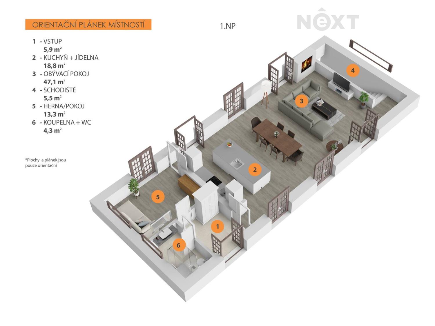 • prostorný otevřený obytný prostor – kuchyně, jídelna a obývací pokoj, za kterým se po schodišti dostanete do 1.PP