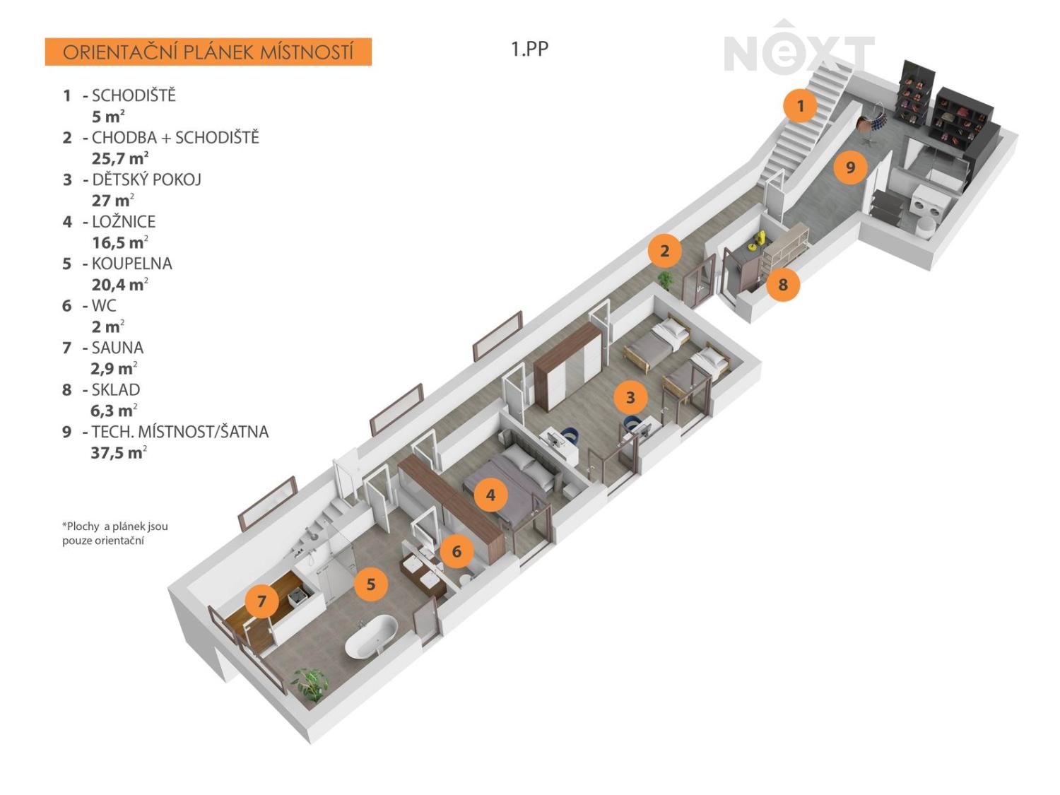 • koupelna se samostatným WC a saunou