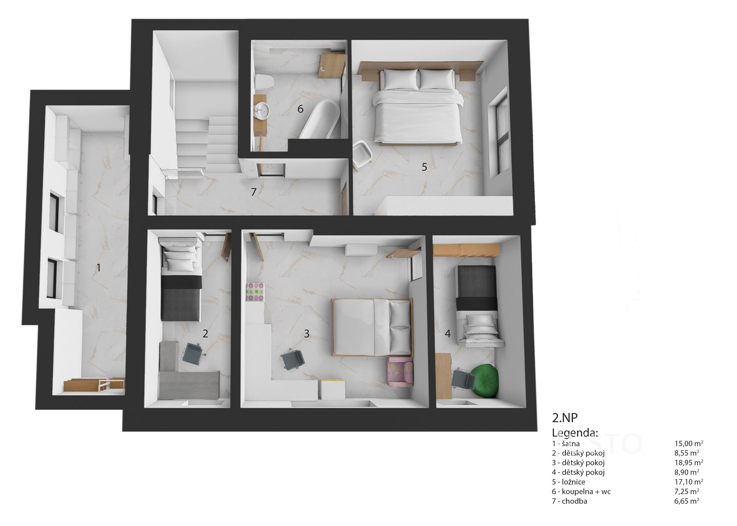 - dispozice 5+kk se dvěma koupelnami, dvěma šatnami a technickou místností