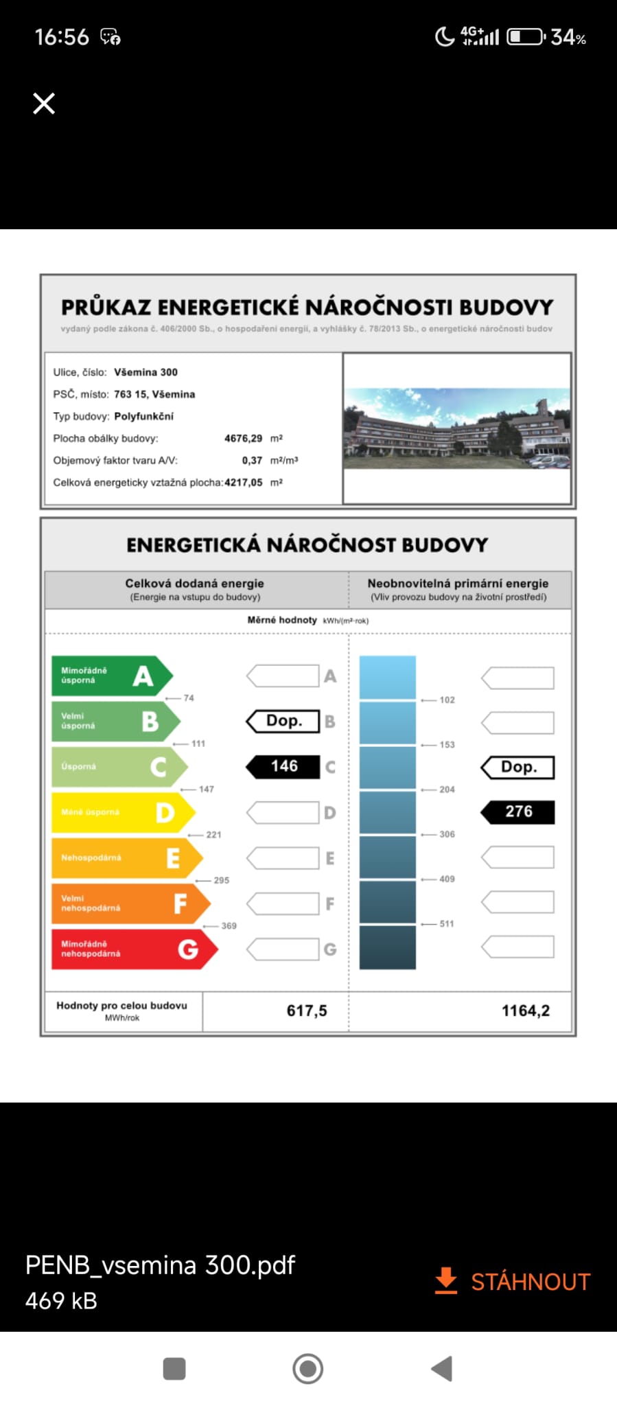 - Ukazatel energetické náročnosti budovy: 146 kWh/m²
