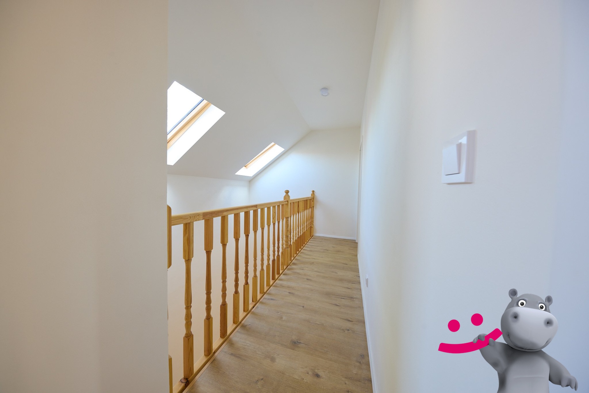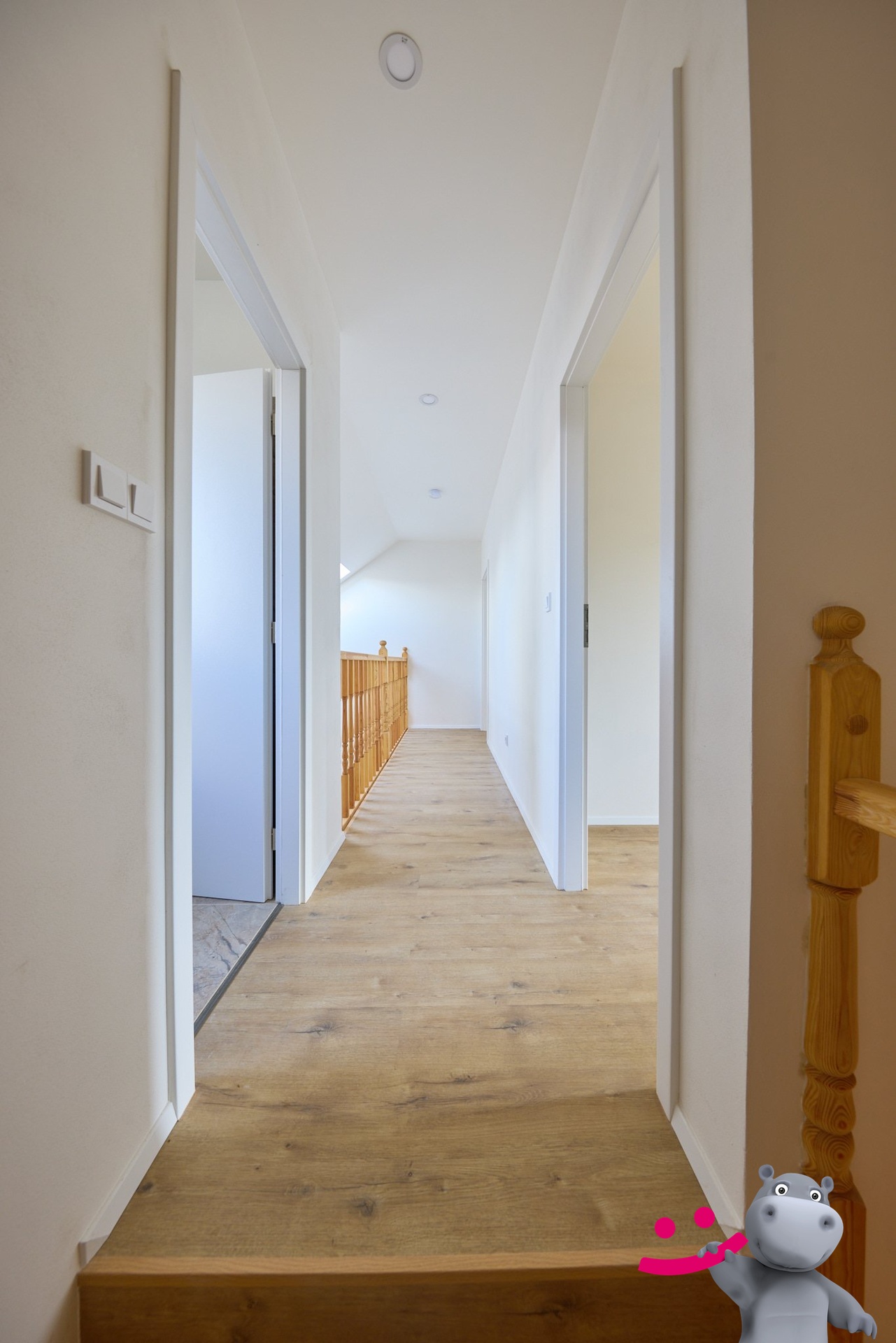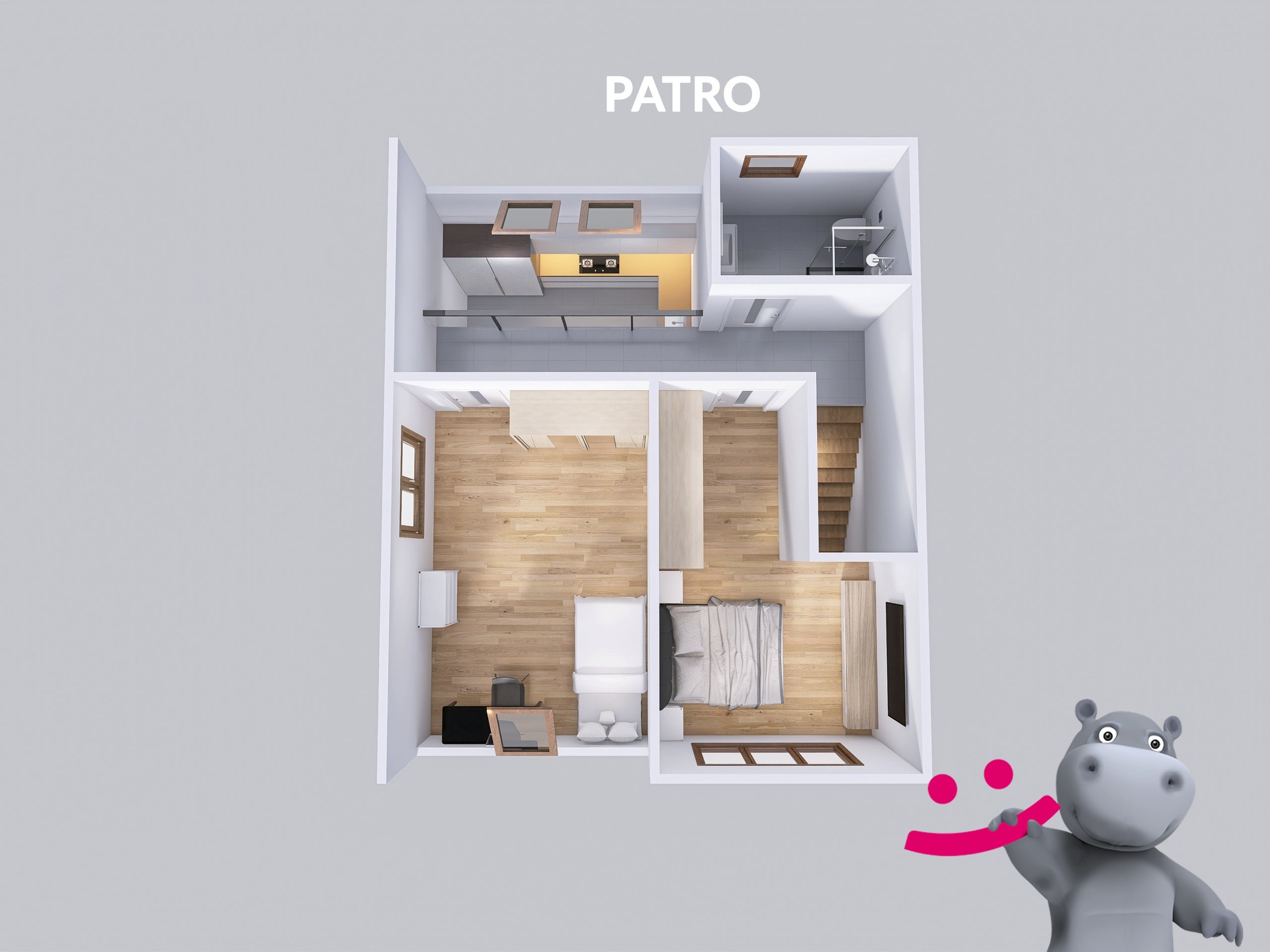 Patro – Galerie, velký pokoj, ložnice, koupelna s toaletou.