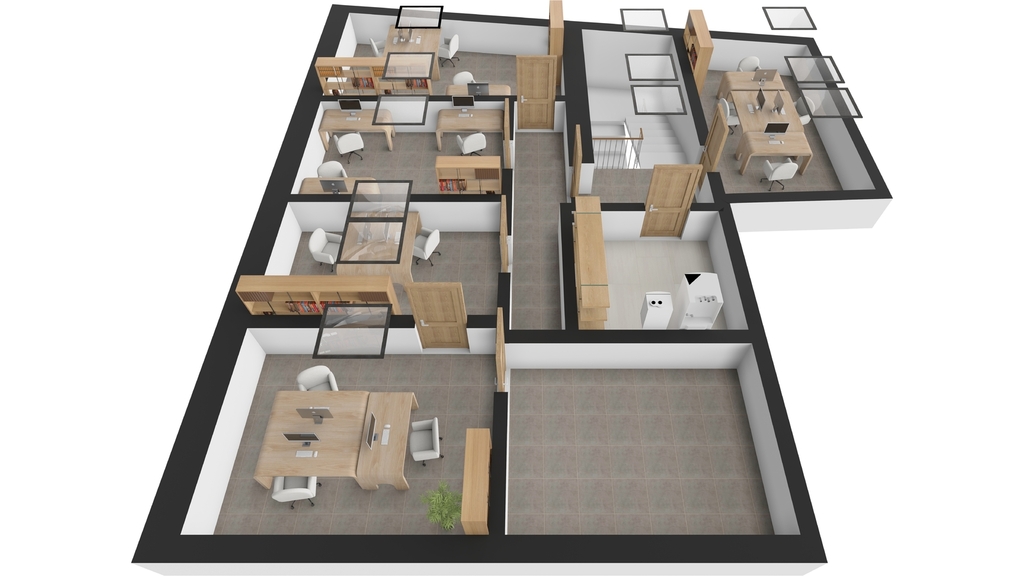 – Přízemí: obchodní pobočka pro veřejnost, zázemí, kuchyňka, sociální zařízení, dílna a sklad
