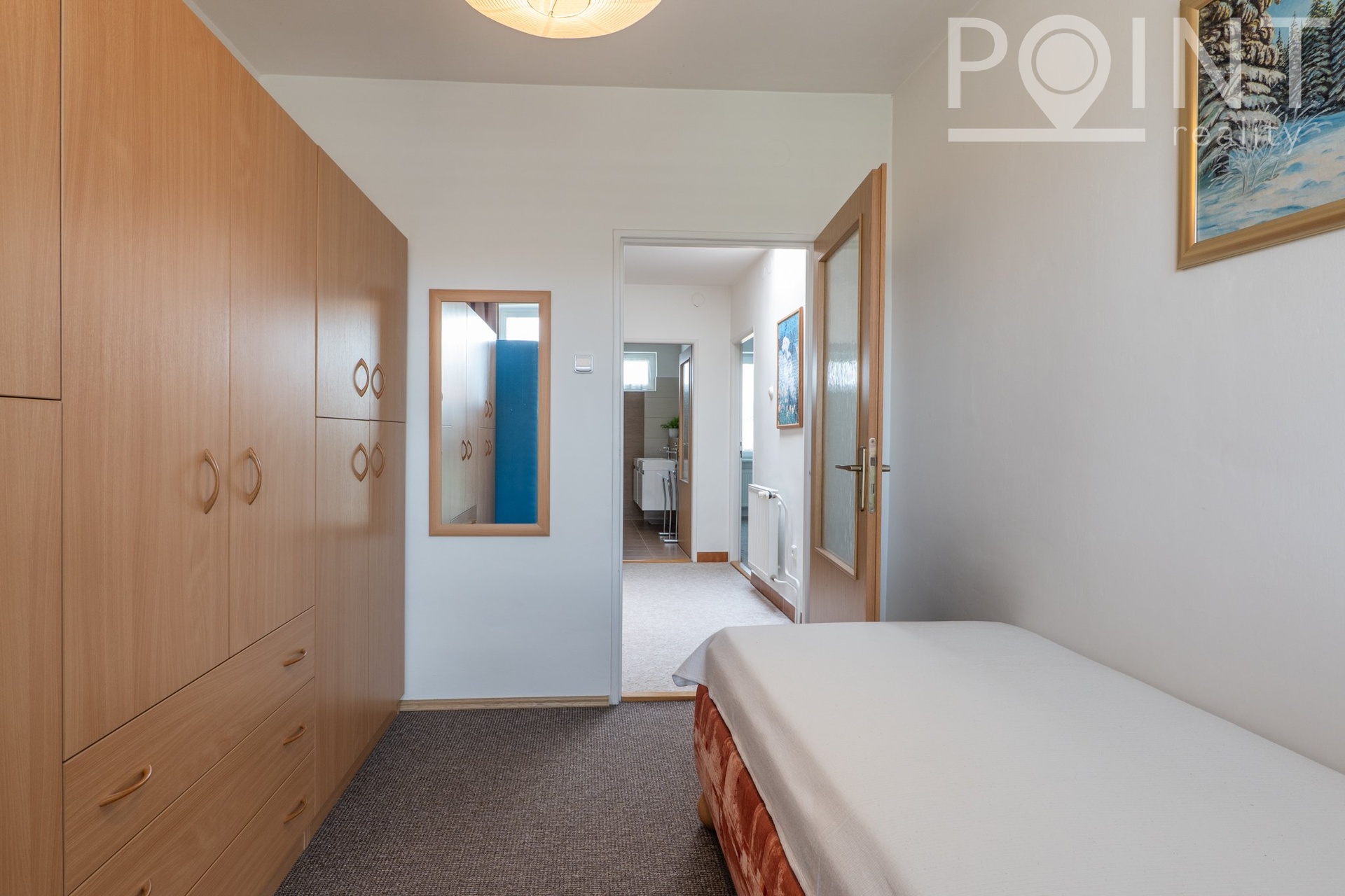 pokoj, koupelna s toaletou a sprchovým koutem.